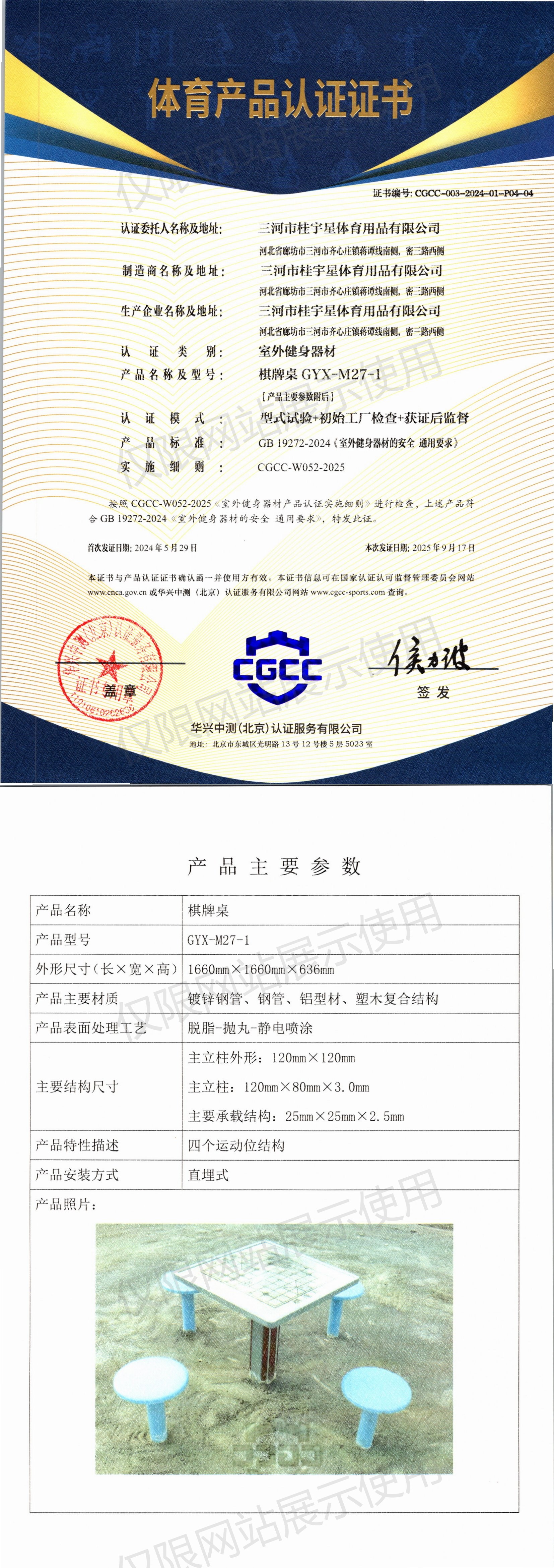 | 10 | 三河市桂宇星体育用品有限公司 | CGCC-003-2024-01-P04-04 | 棋牌桌 | GYX-M27-1 | 河北省廊坊市三河市齐心庄镇蒋谭线南侧,密三路西侧 | GB 19272-2024 | 2024-05-29 | 有效 | 查看 |