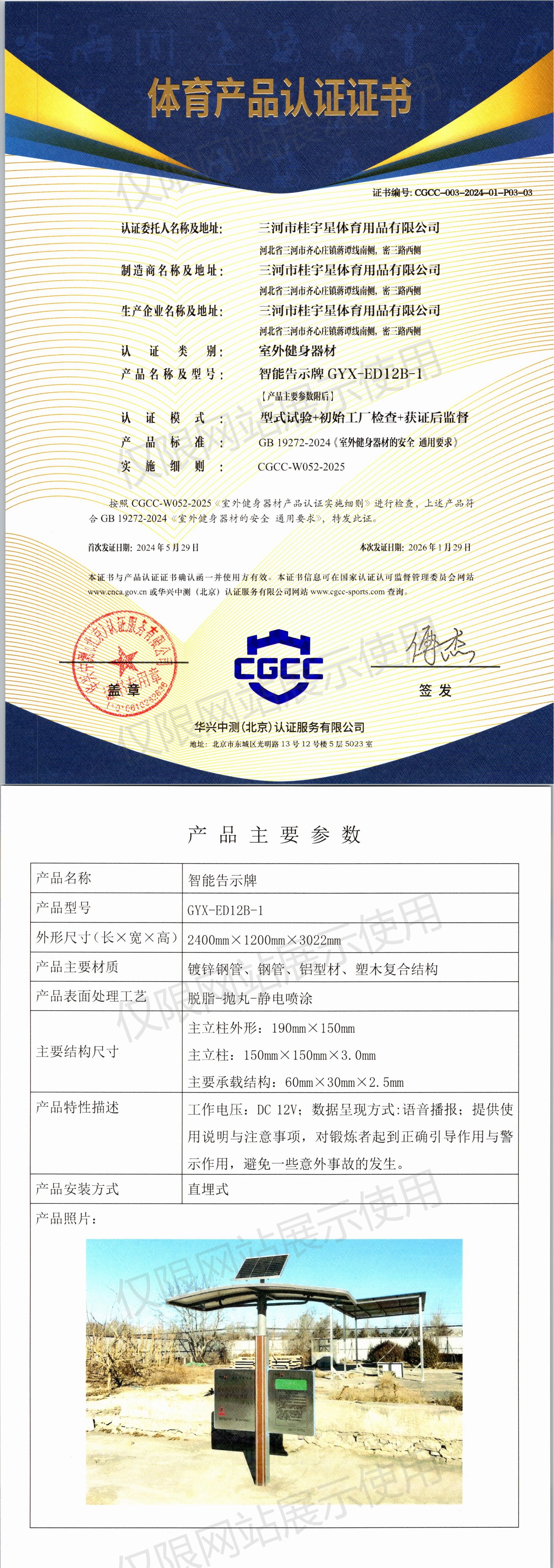 | 4 | 三河市桂宇星体育用品有限公司 | CGCC-003-2024-01-P03-03 | 智能告示牌 | GYX-ED12B-1 | 河北省廊坊市三河市齐心庄镇蒋谭线南侧,密三路西侧 | GB 19272-2024 | 2024-05-29 | 有效 | 查看 |