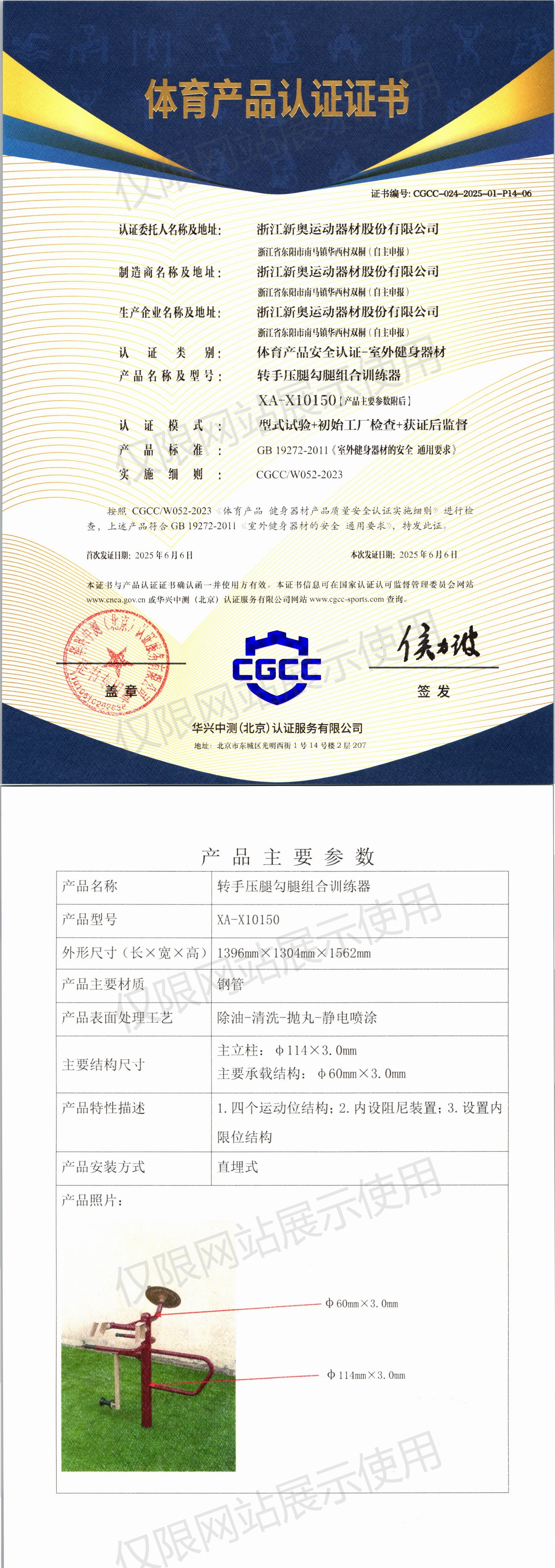 | 3 | 浙江新奥运动器材股份有限公司 | CGCC-024-2025-01-P14-06 | 转手压腿勾腿组合训练器 | XA-X10150 | 浙江省东阳市南马镇华西村双桐(自主申报) | GB 19272-2011 | 2025-06-06 | 有效 | 查看 |