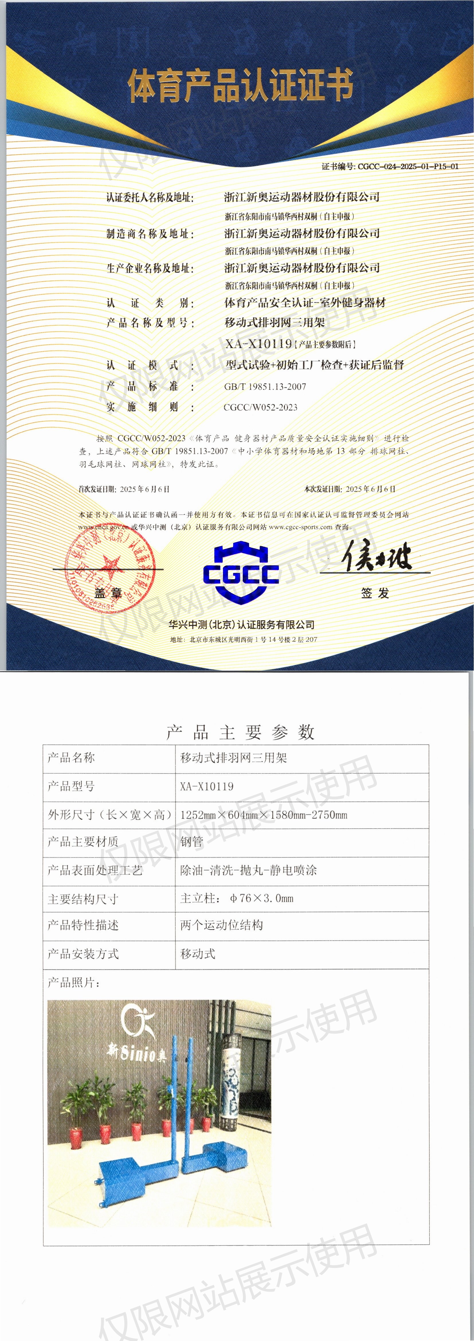 | 4 | 浙江新奥运动器材股份有限公司 | CGCC-024-2025-01-P15-01 | 移动式排羽网三用架 | XA-X10119 | 浙江省东阳市南马镇华西村双桐(自主申报) | GB/T 19851.13-2007 | 2025-06-06 | 有效 | 查看 |