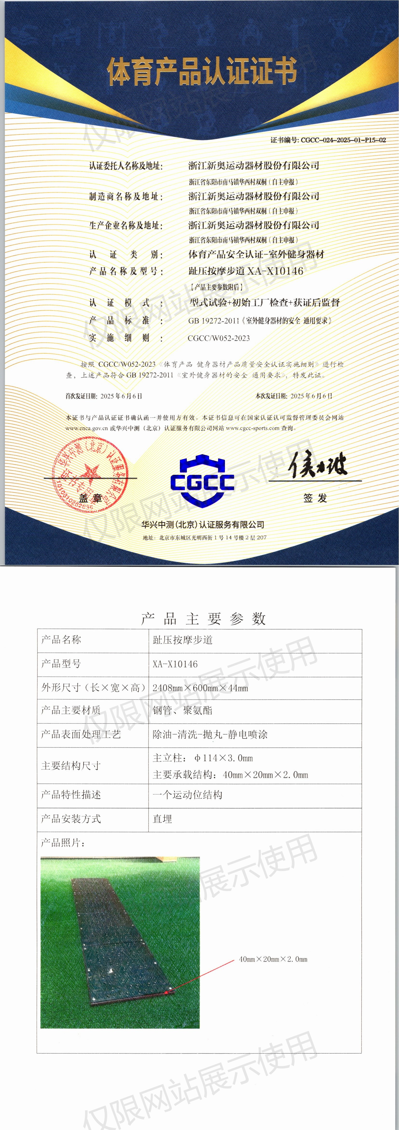 | 5 | 浙江新奥运动器材股份有限公司 | CGCC-024-2025-01-P15-02 | 趾压按摩步道 | XA-X10146 | 浙江省东阳市南马镇华西村双桐(自主申报) | GB 19272-2011 | 2025-06-06 | 有效 | 查看 |