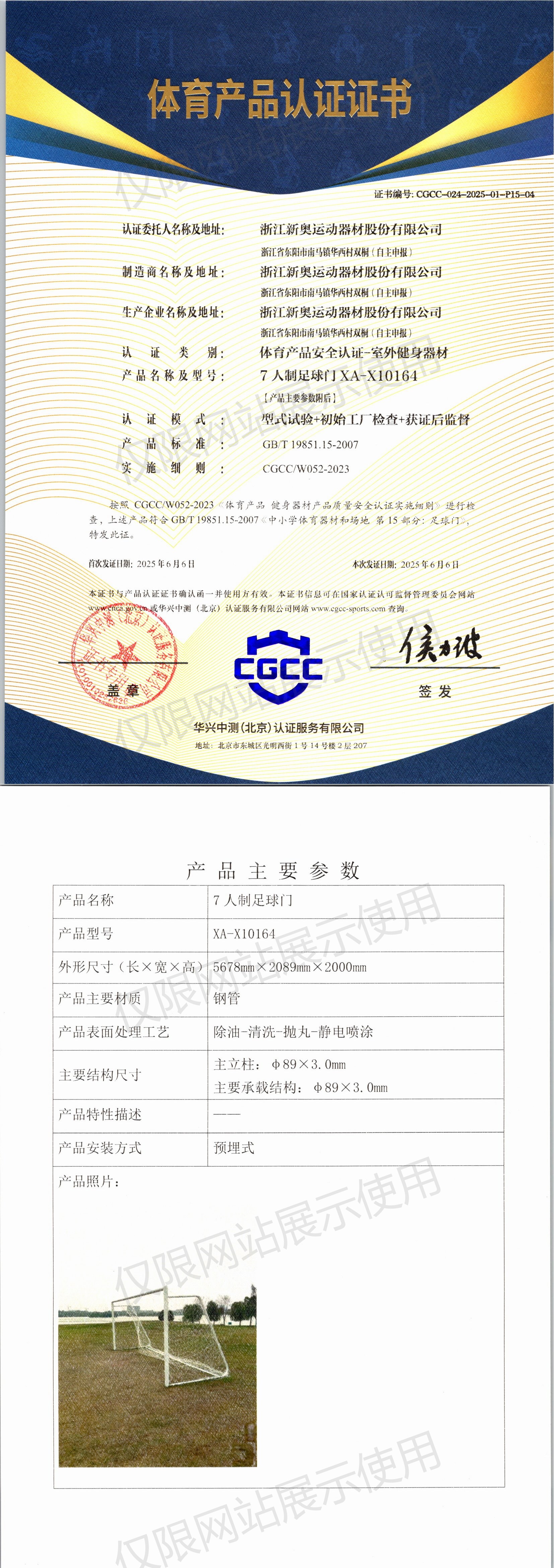 | 7 | 浙江新奥运动器材股份有限公司 | CGCC-024-2025-01-P15-04 | 7人制足球门 | XA-X10164 | 浙江省东阳市南马镇华西村双桐(自主申报) | GB/T 19851.15-2007 | 2025-06-06 | 有效 | 查看 |