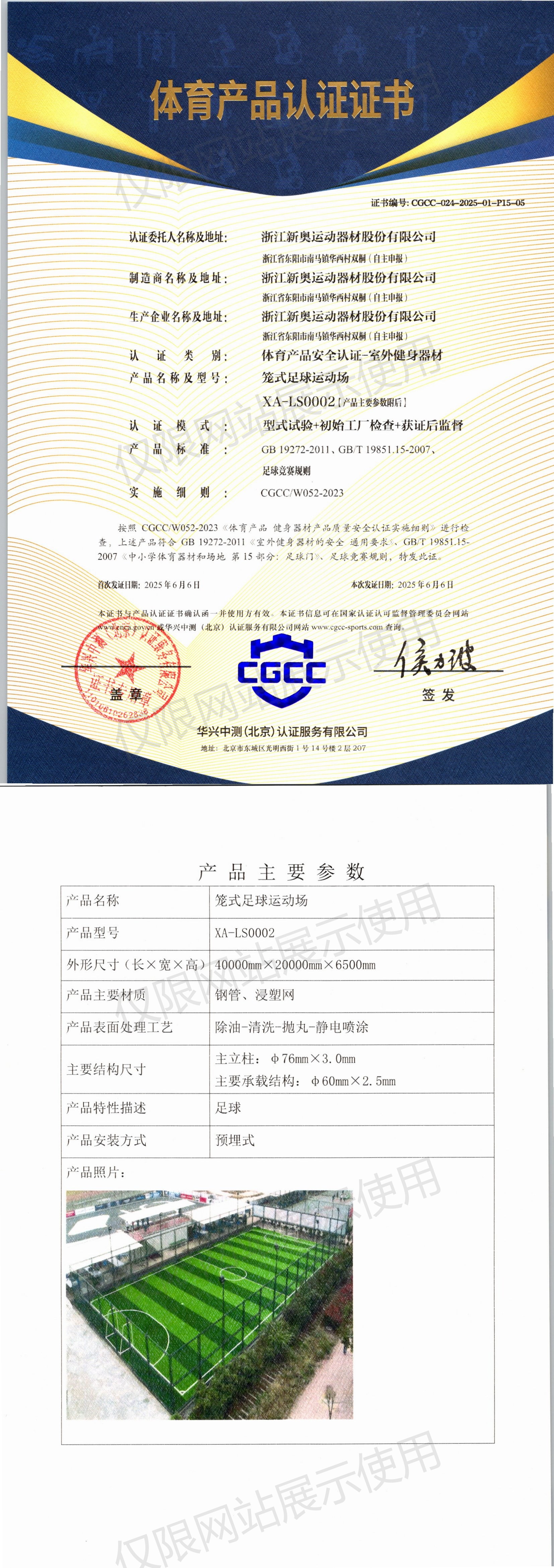 | 8 | 浙江新奥运动器材股份有限公司 | CGCC-024-2025-01-P15-05 | 笼式足球运动场 | XA-LS0002 | 浙江省东阳市南马镇华西村双桐(自主申报) | GB 19272-2011、GB/T 19851.15-2007、足球竞赛规则 | 2025-06-06 | 有效 | 查看 |