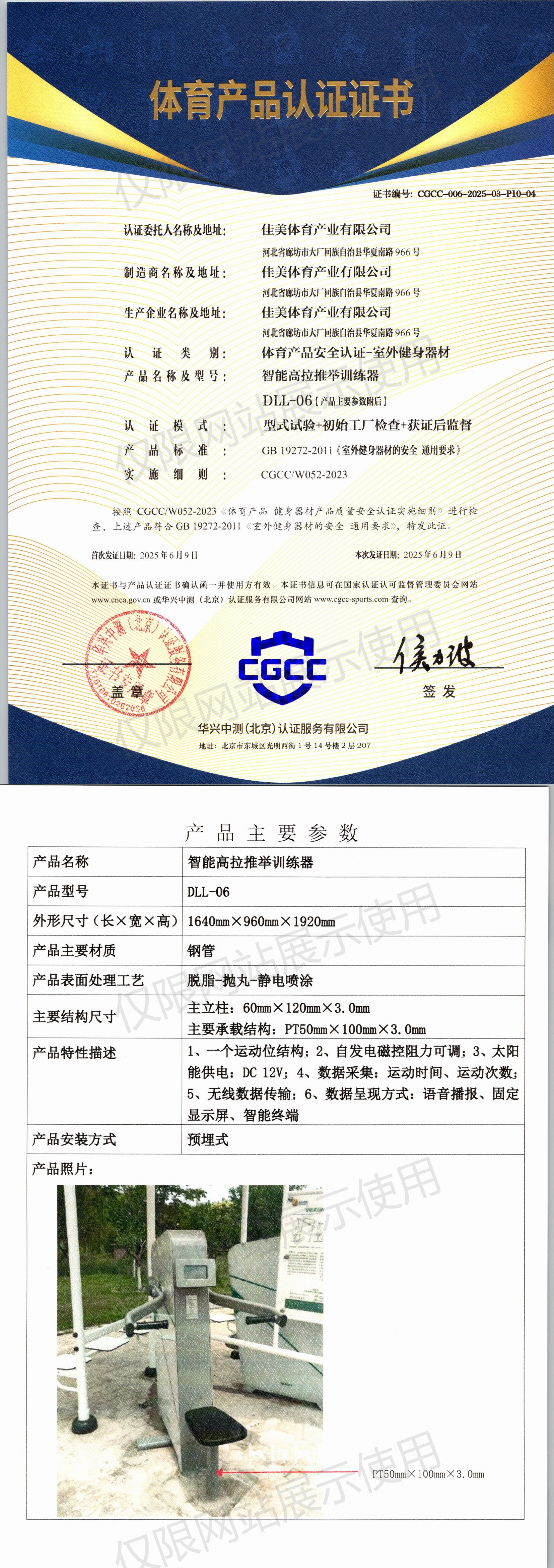 | 9 | 佳美体育产业有限公司 | CGCC-006-2025-03-P10-04 | 智能高拉推举训练器 | DLL-06 | 河北省廊坊市大厂回族自治县华夏南路966号 | GB 19272-2011 | 2025-06-09 | 有效 | 查看 |