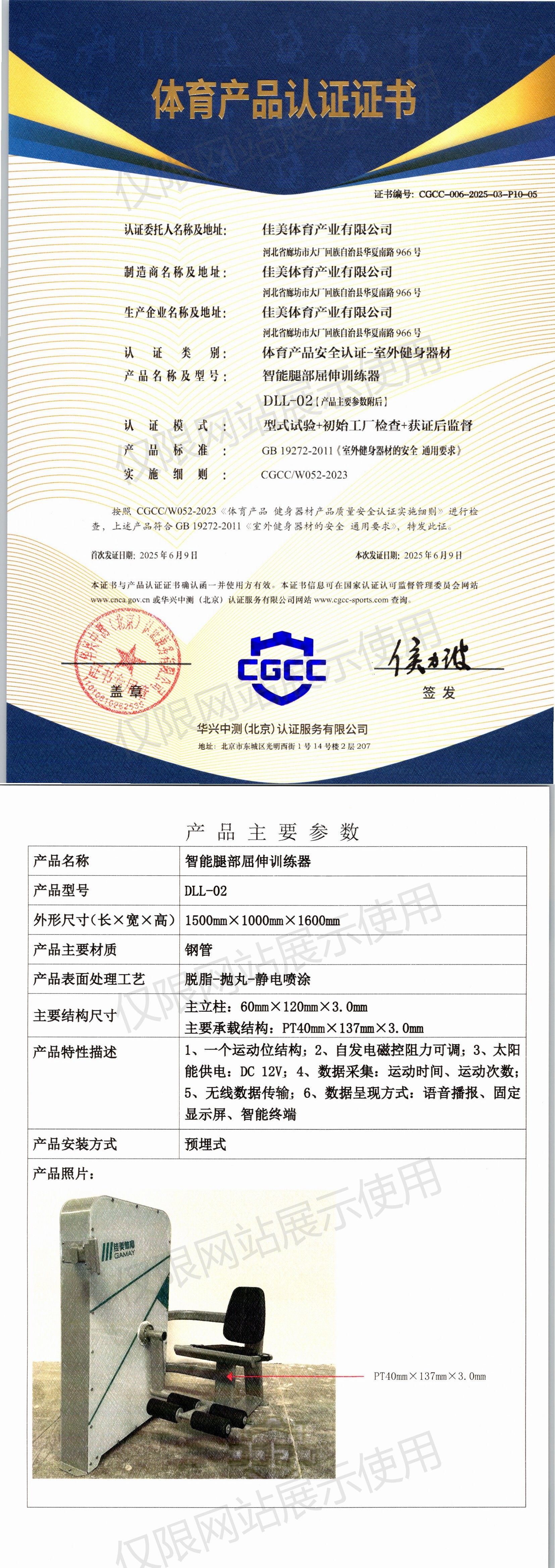 | 10 | 佳美体育产业有限公司 | CGCC-006-2025-03-P10-05 | 智能腿部屈伸训练器 | DLL-02 | 河北省廊坊市大厂回族自治县华夏南路966号 | GB 19272-2011 | 2025-06-09 | 有效 | 查看 |