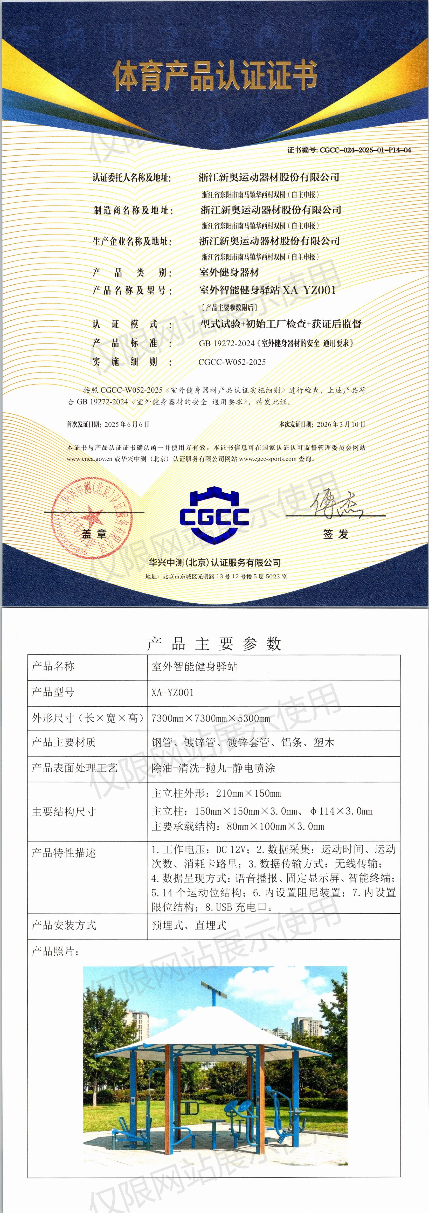 | 1 | 浙江新奥运动器材股份有限公司 | CGCC-024-2025-01-P14-04 | 室外智能健身驿站 | XA-YZ001 | 浙江省东阳市南马镇华西村双桐(自主申报) | GB 19272-2024 | 2025-06-06 | 有效 | 查看 |