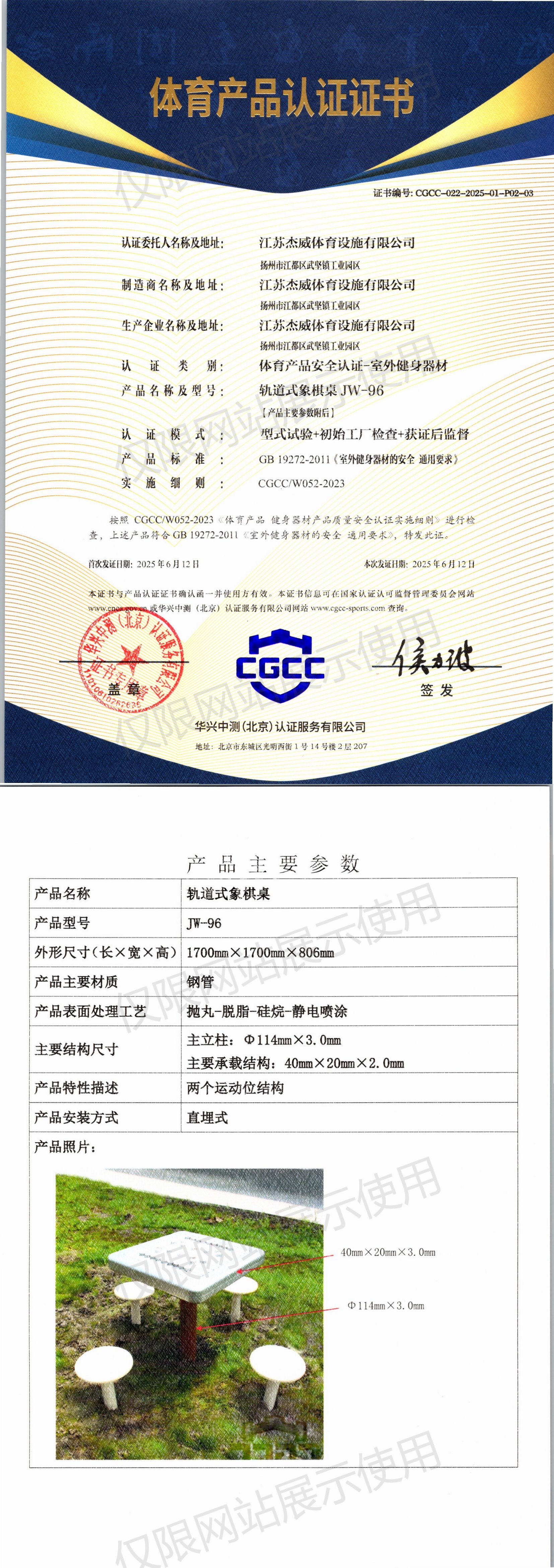 | 2 | 江苏杰威体育设施有限公司 | CGCC-022-2025-01-P02-03 | 轨道式象棋桌 | JW-96 | 扬州市江都区武坚镇工业园区 | GB 19272-2011 | 2025-06-12 | 有效 | 查看 |