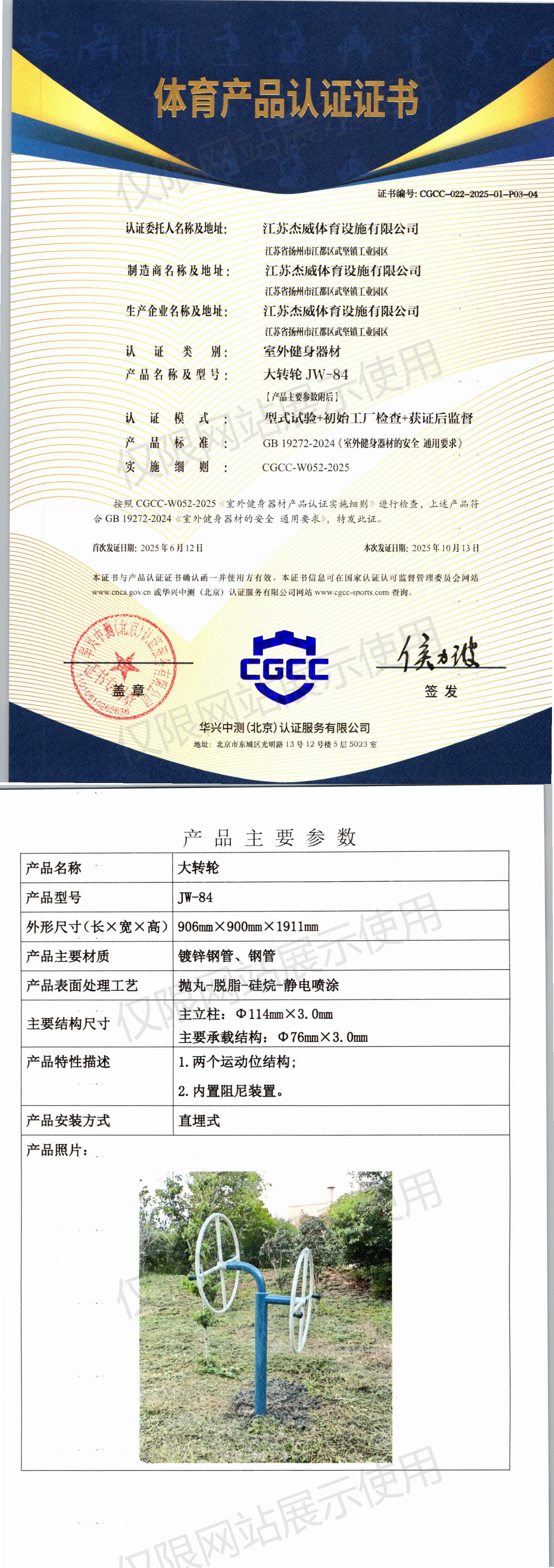 | 7 | 江苏杰威体育设施有限公司 | CGCC-022-2025-01-P03-04 | 大转轮 | JW-84 | 江苏省扬州市江都区武坚镇工业园区 | GB 19272-2024 | 2025-06-12 | 有效 | 查看 |