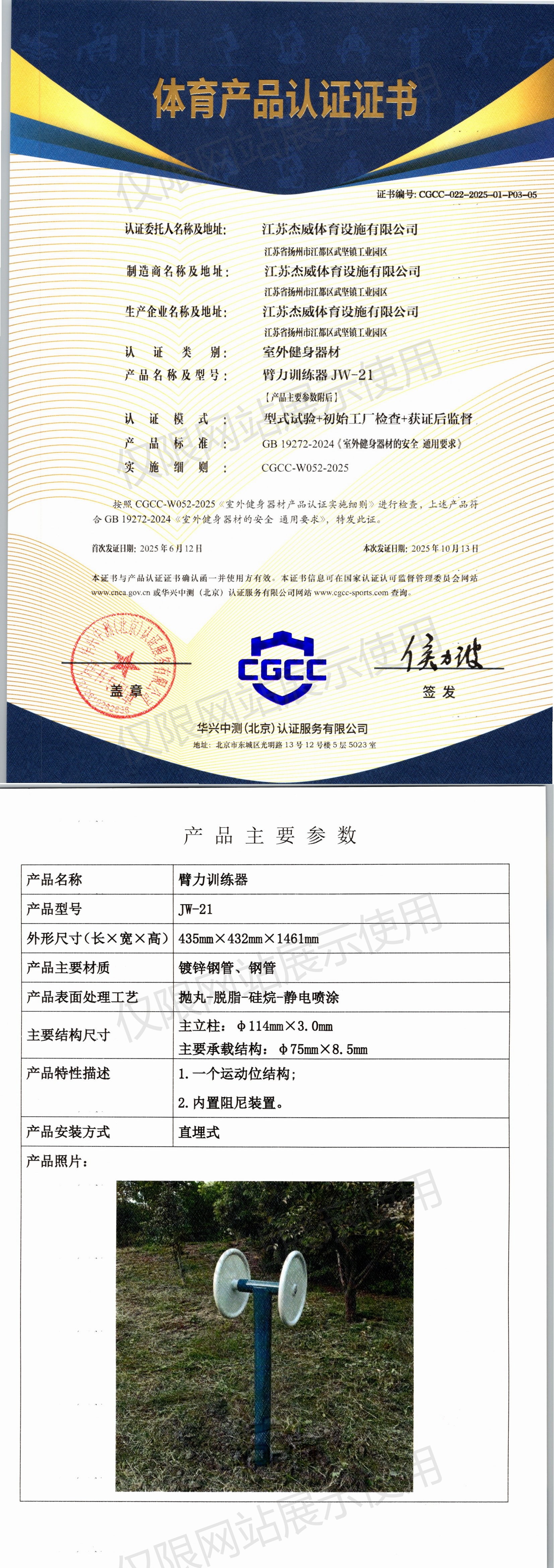 | 8 | 江苏杰威体育设施有限公司 | CGCC-022-2025-01-P03-05 | 臂力训练器 | JW-21 | 江苏省扬州市江都区武坚镇工业园区 | GB 19272-2024 | 2025-06-12 | 有效 | 查看 |