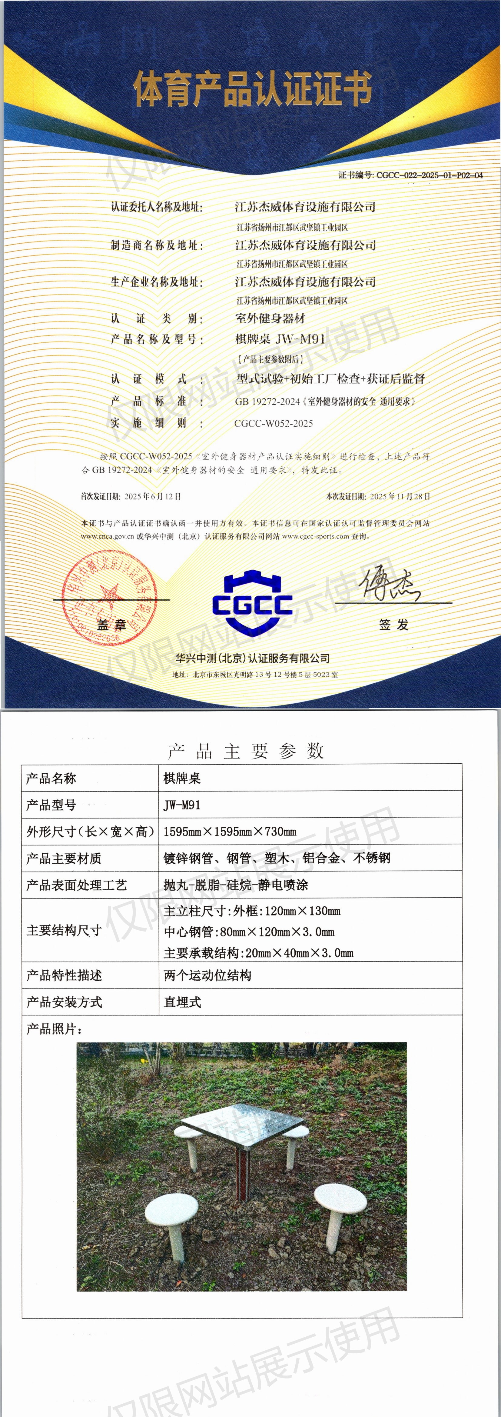 | 3 | 江苏杰威体育设施有限公司 | CGCC-022-2025-01-P02-04 | 棋牌桌 | JW-M91 | 江苏省扬州市江都区武坚镇工业园区 | GB 19272-2024 | 2025-06-12 | 有效 | 查看 |