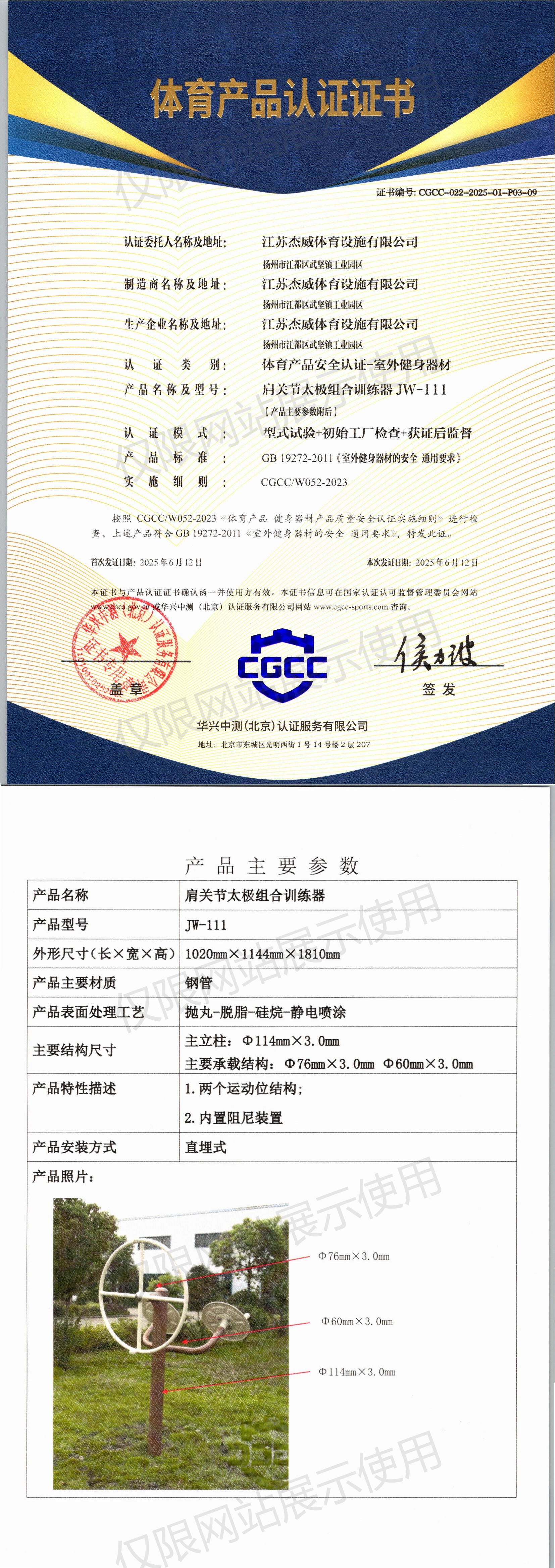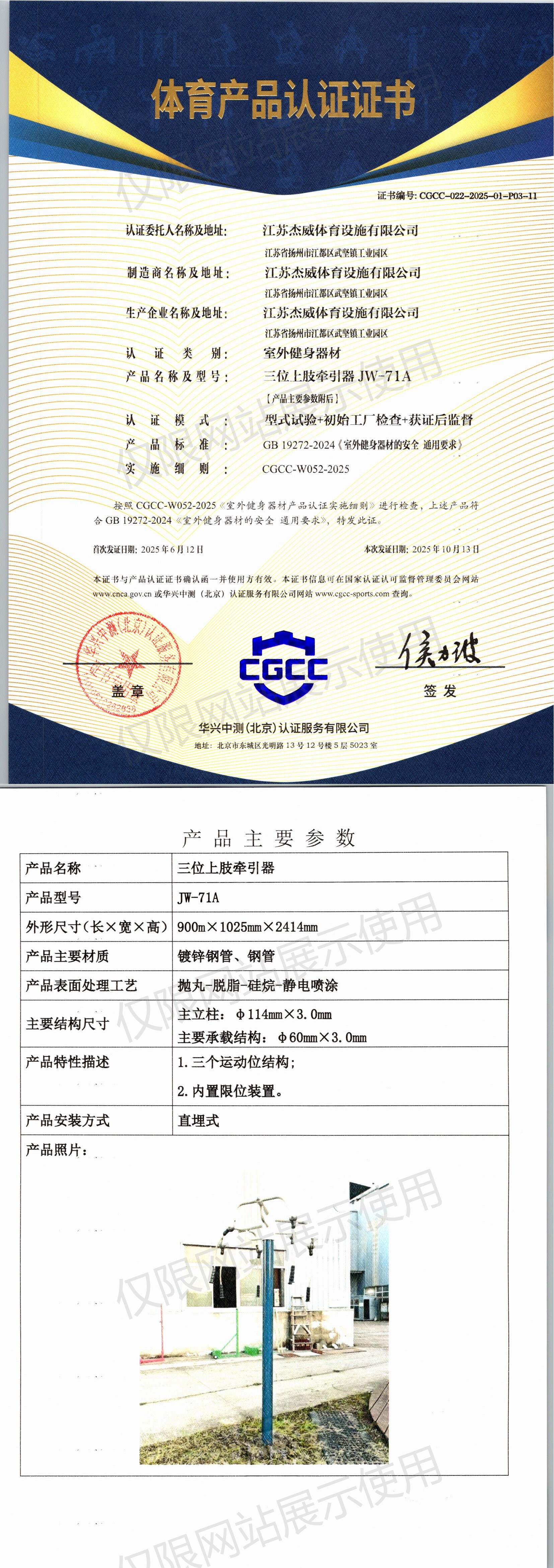| 4 | 江苏杰威体育设施有限公司 | CGCC-022-2025-01-P03-11 | 三位上肢牵引器 | JW-71A | 江苏省扬州市江都区武坚镇工业园区 | GB 19272-2024 | 2025-06-12 | 有效 | 查看 |