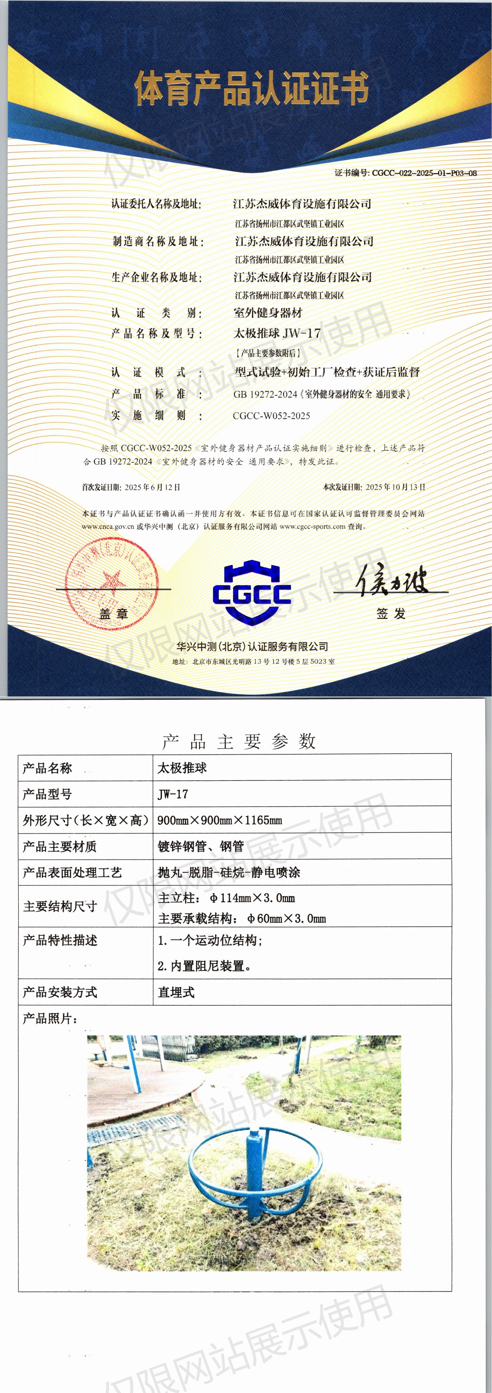 | 1 | 江苏杰威体育设施有限公司 | CGCC-022-2025-01-P03-08 | 太极推球 | JW-17 | 江苏省扬州市江都区武坚镇工业园区 | GB 19272-2024 | 2025-06-12 | 有效 | 查看 |