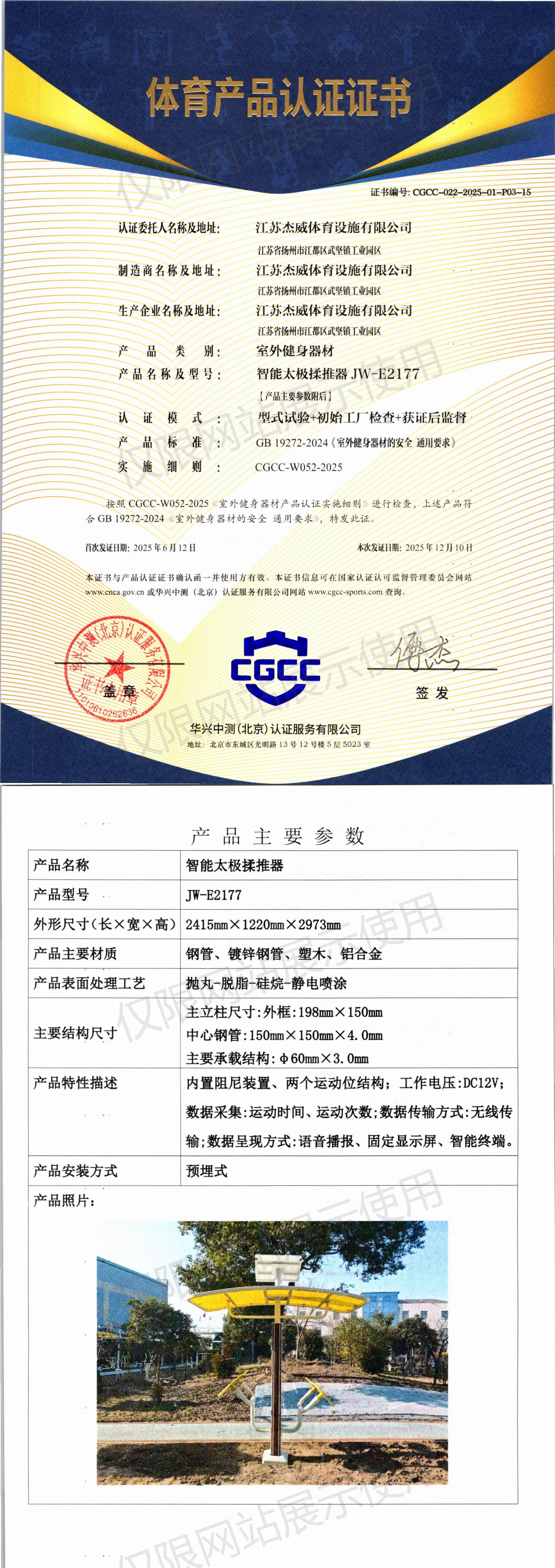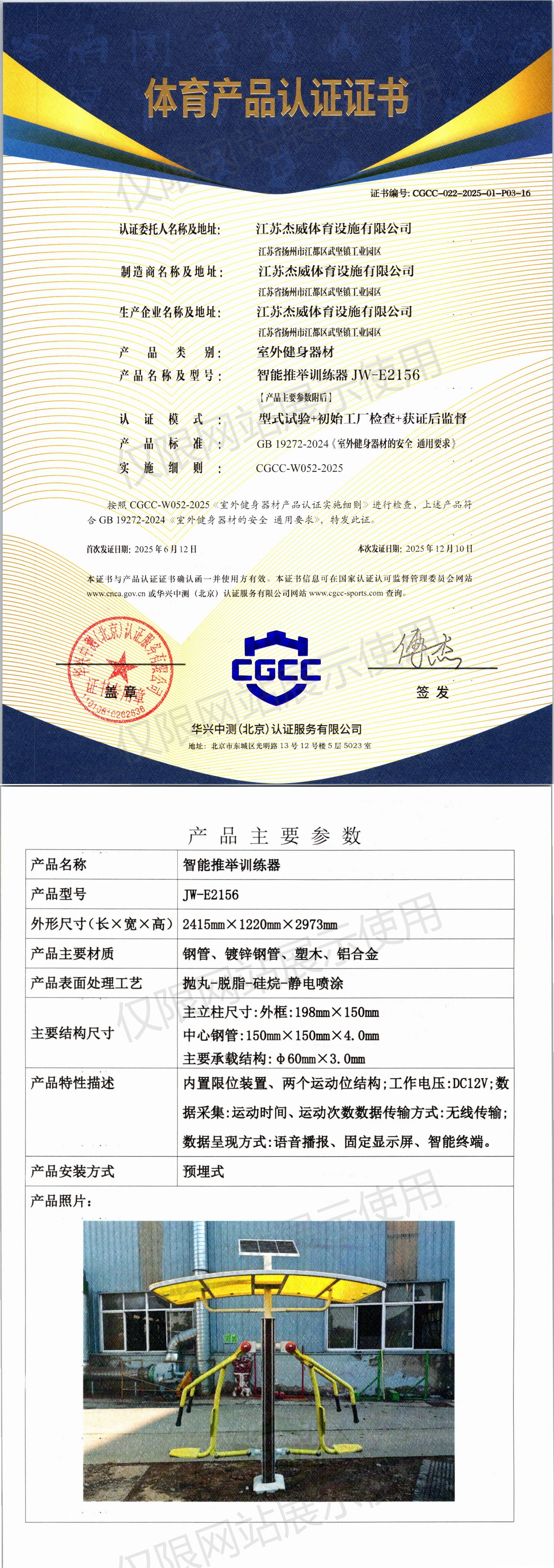 | 8 | 江苏杰威体育设施有限公司 | CGCC-022-2025-01-P03-15 | 智能太极揉推器 | JW-E2177 | 扬州市江都区武坚镇工业园区 | GB 19272-2024 | 2025-06-12 | 有效 | 查看 |