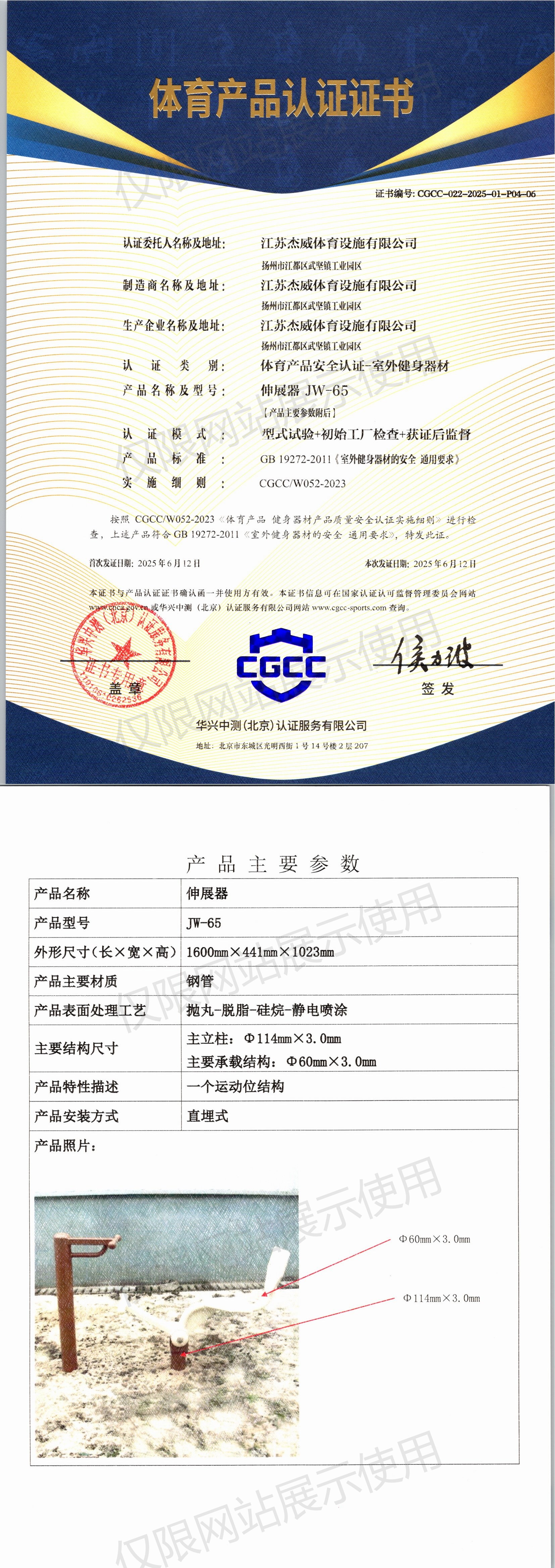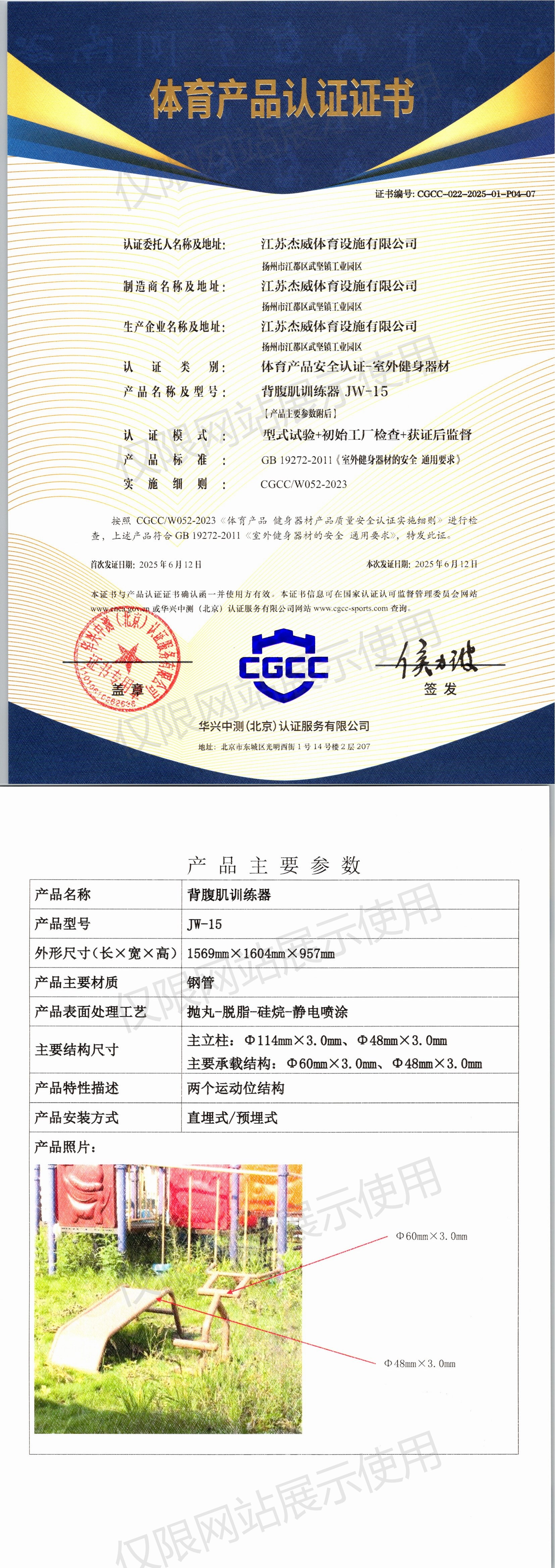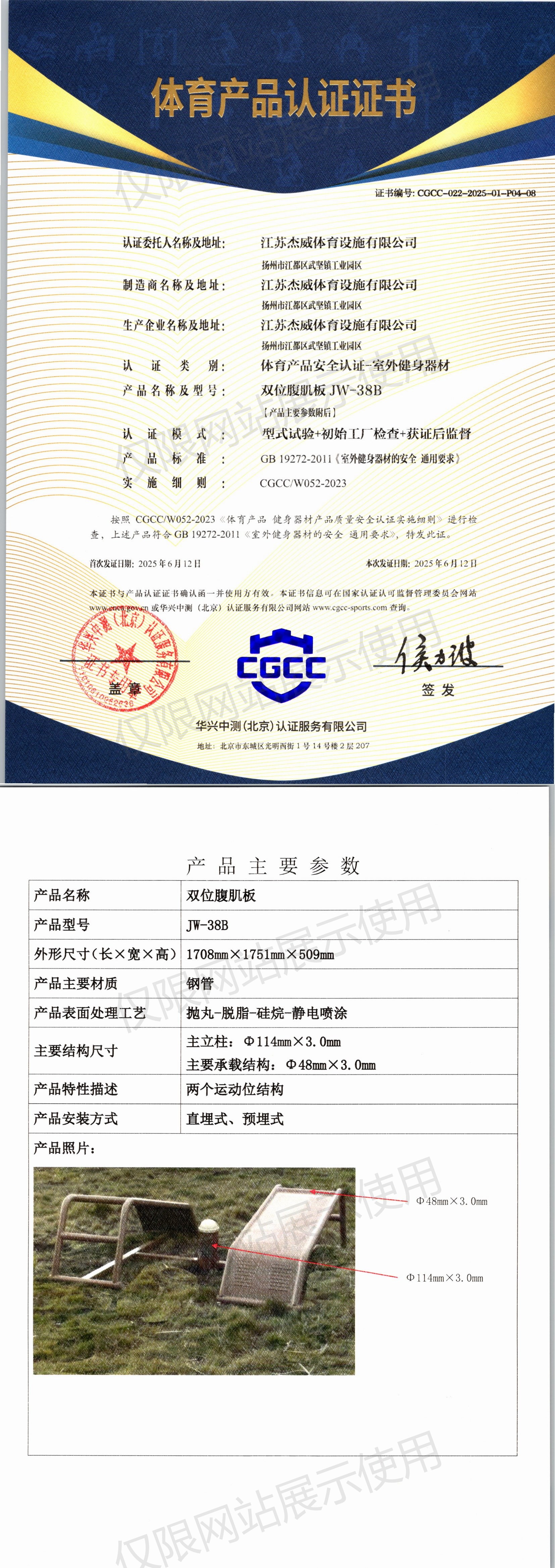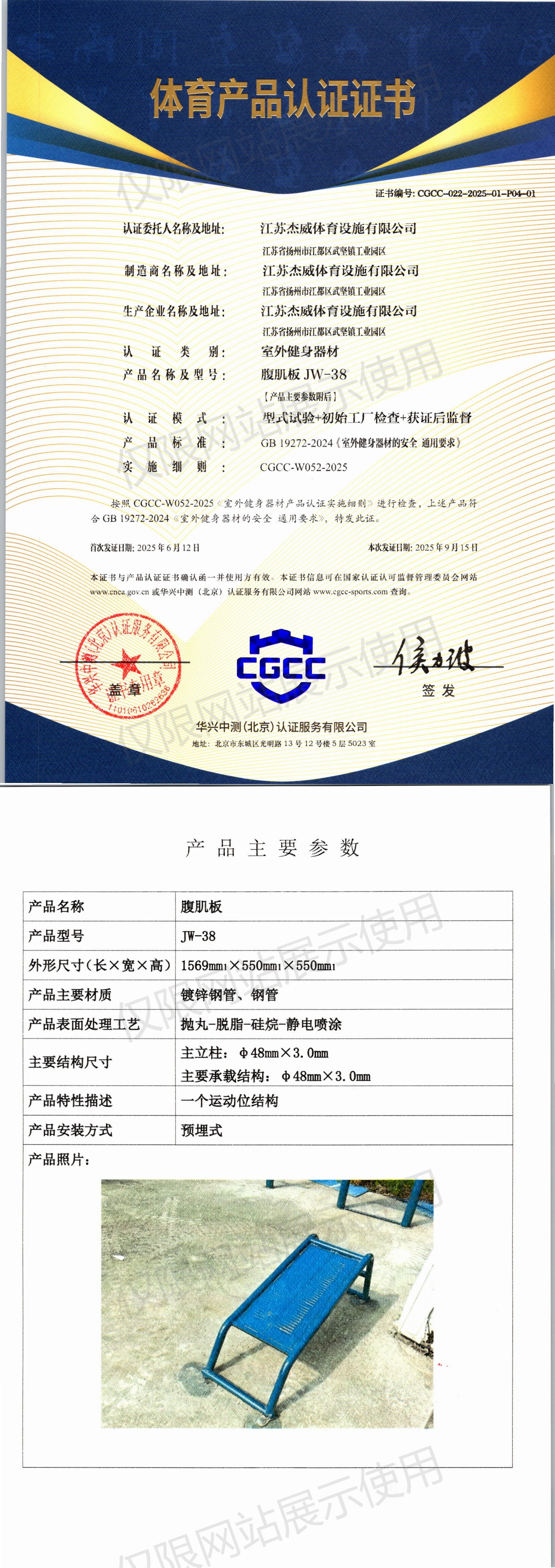 | 2 | 江苏杰威体育设施有限公司 | CGCC-022-2025-01-P04-01 | 腹肌板 | JW-38 | 江苏省扬州市江都区武坚镇工业园区 | GB 19272-2024 | 2025-06-12 | 有效 | 查看 |