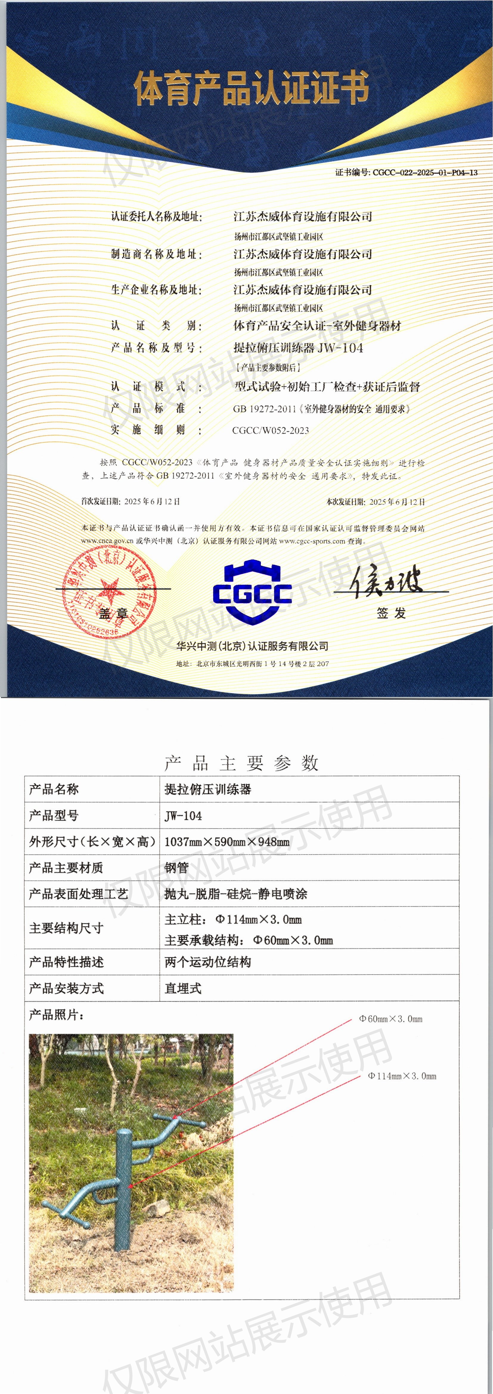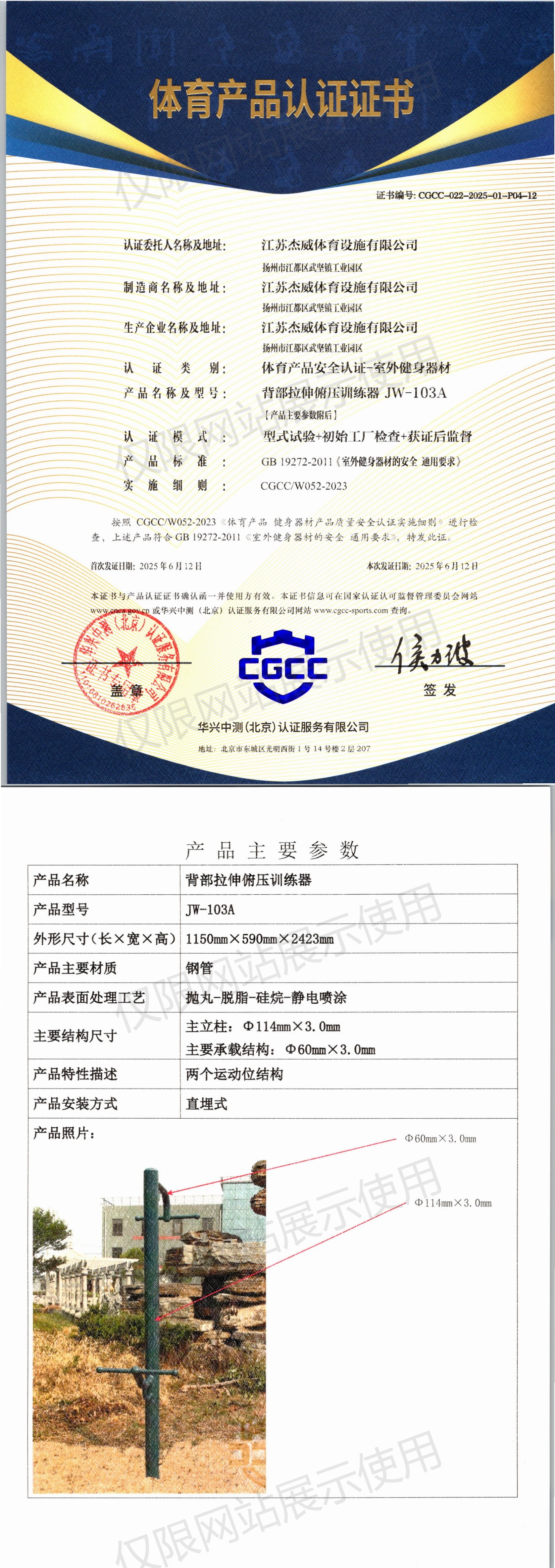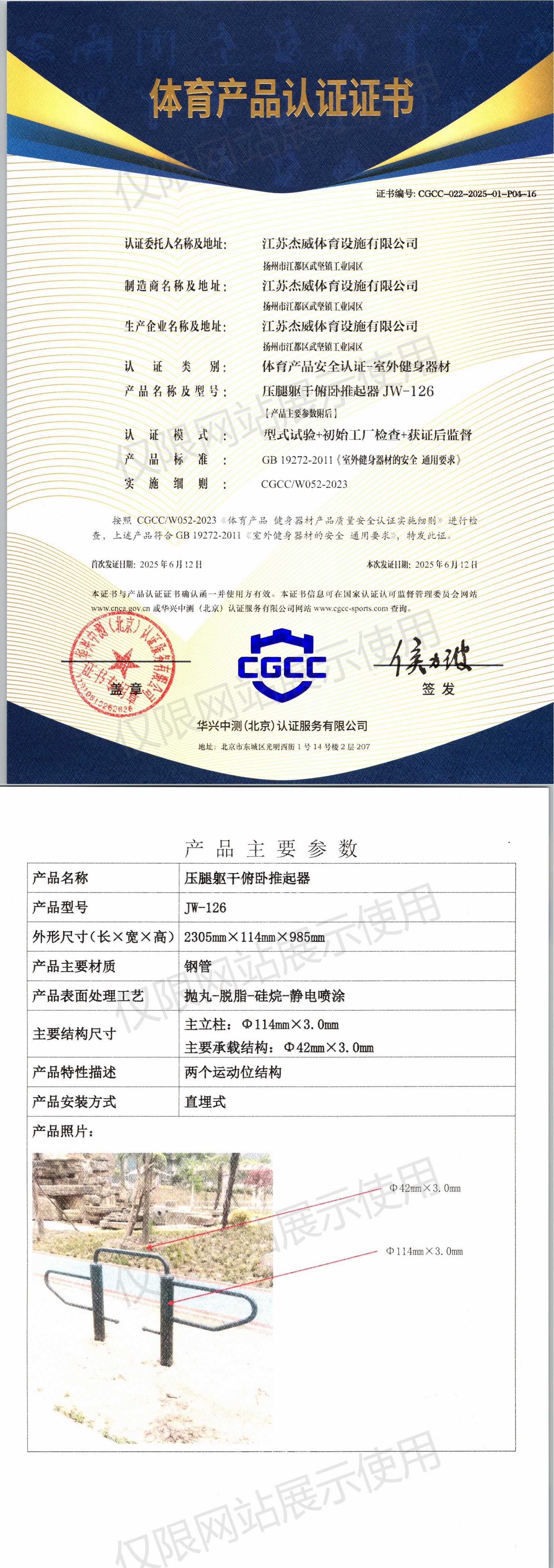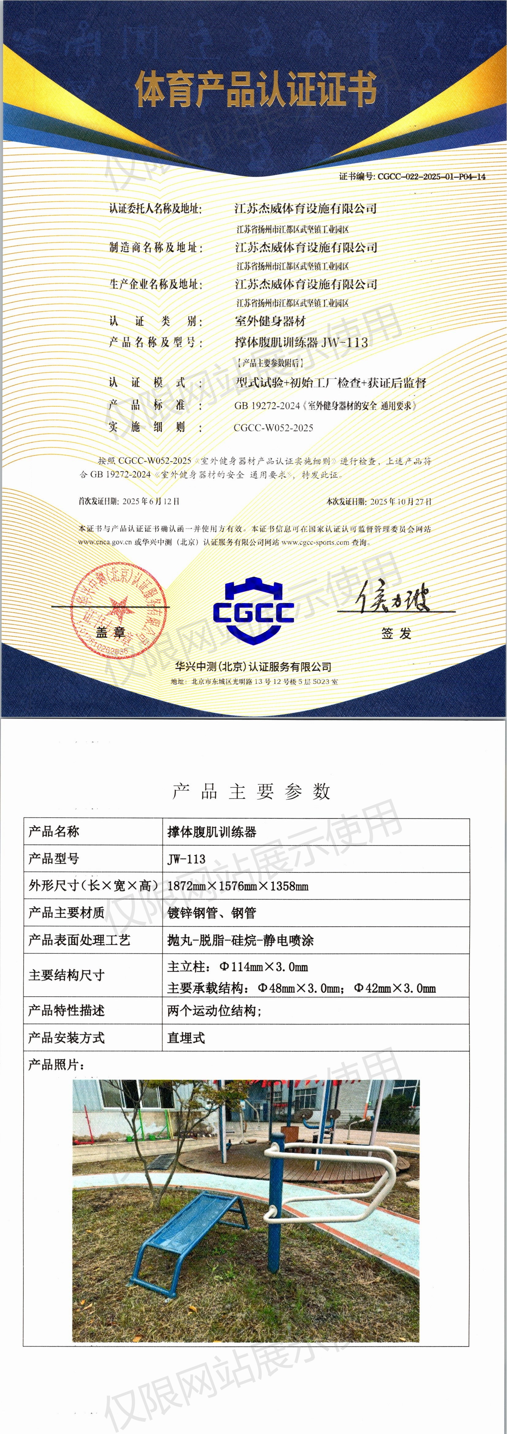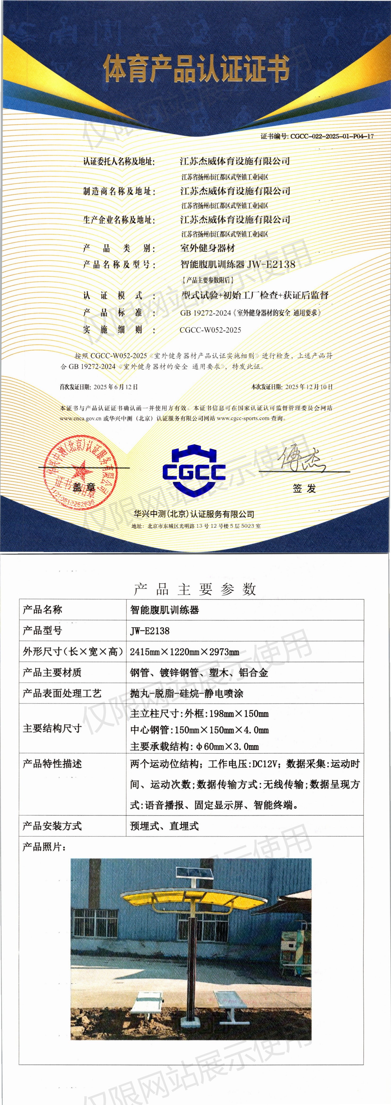 | 10 | 江苏杰威体育设施有限公司 | CGCC-022-2025-01-P04-19 | 腹肌板 | JW-M38 | 江苏省扬州市江都区武坚镇工业园区 | GB 19272-2024 | 2025-06-12 | 有效 | 查看 |
