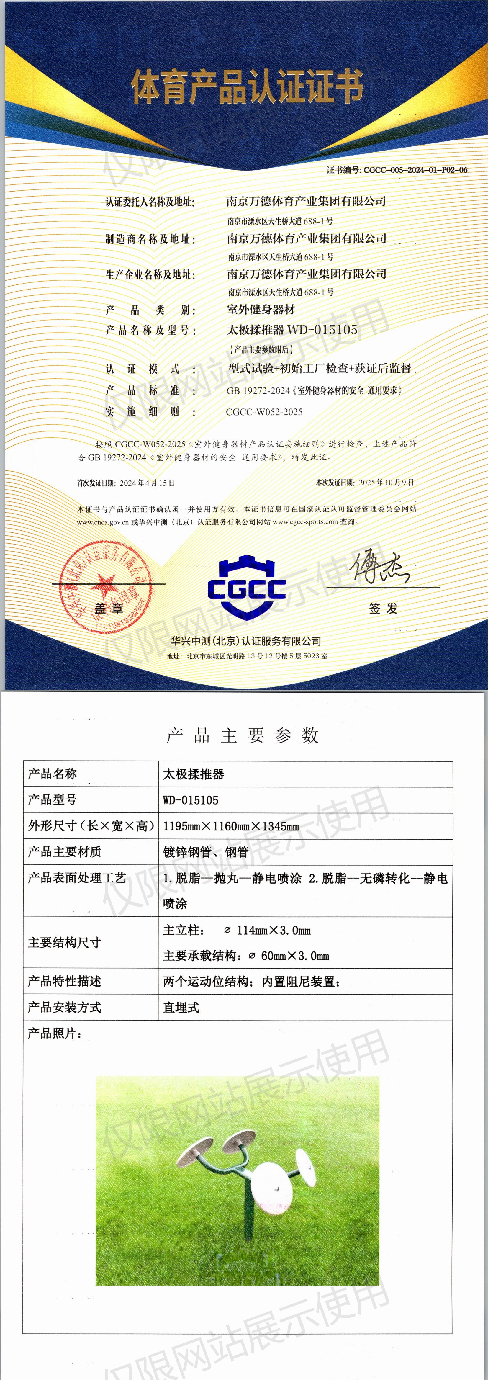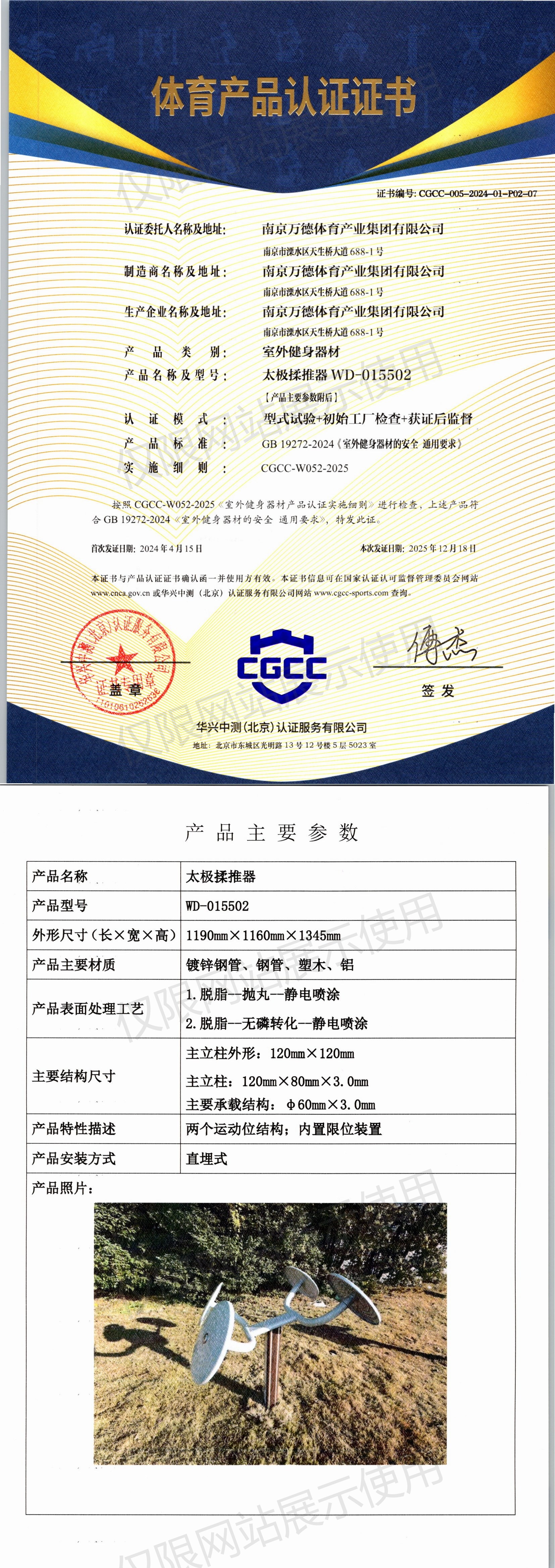 | 9 | 南京万德体育产业集团有限公司 | CGCC-005-2024-01-P02-06 | 太极揉推器 | WD-015105 | 南京市溧水区天生桥大道688-1号 | GB 19272-2024 | 2024-04-15 | 有效 | 查看 |