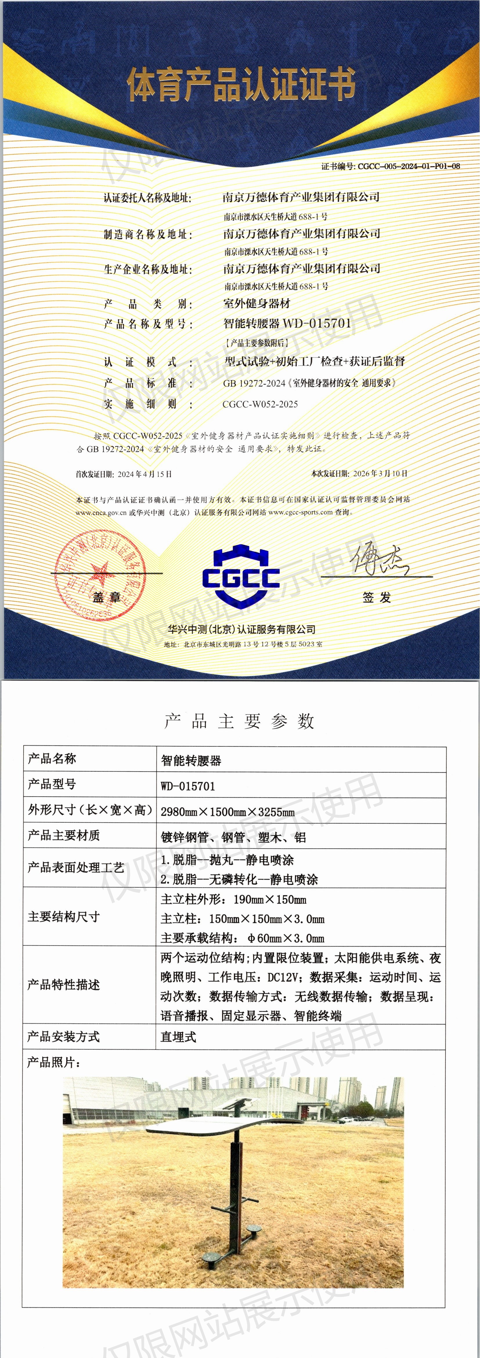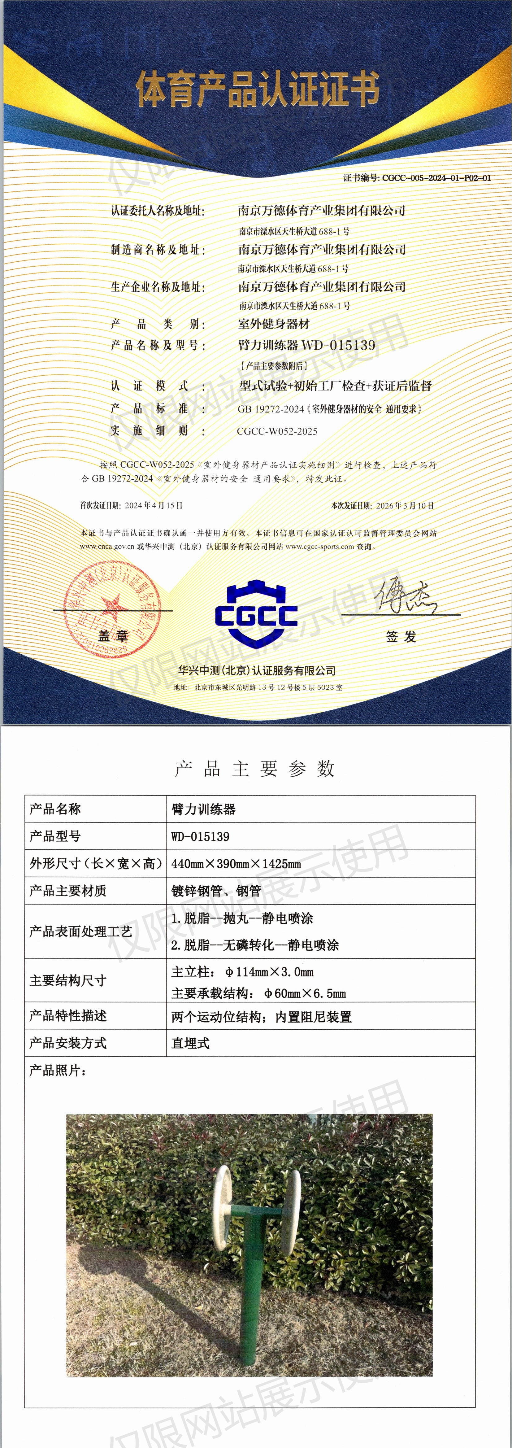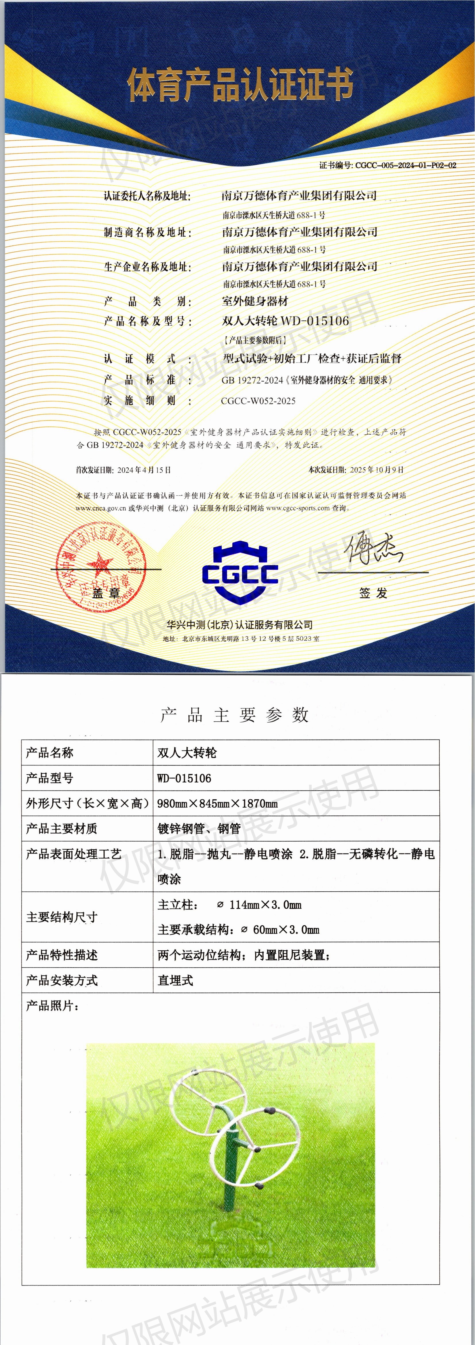 | 5 | 南京万德体育产业集团有限公司 | CGCC-005-2024-01-P02-02 | 双人大转轮 | WD-015106 | 南京市溧水区天生桥大道688-1号 | GB 19272-2024 | 2024-04-15 | 有效 | 查看 |