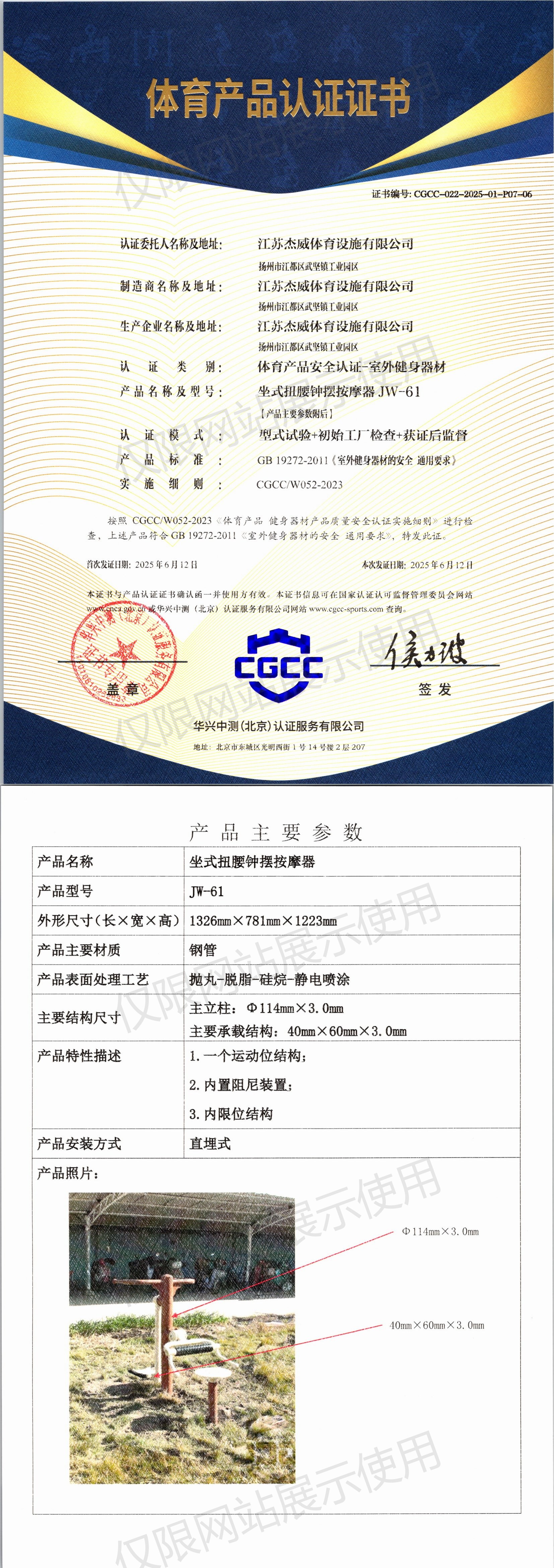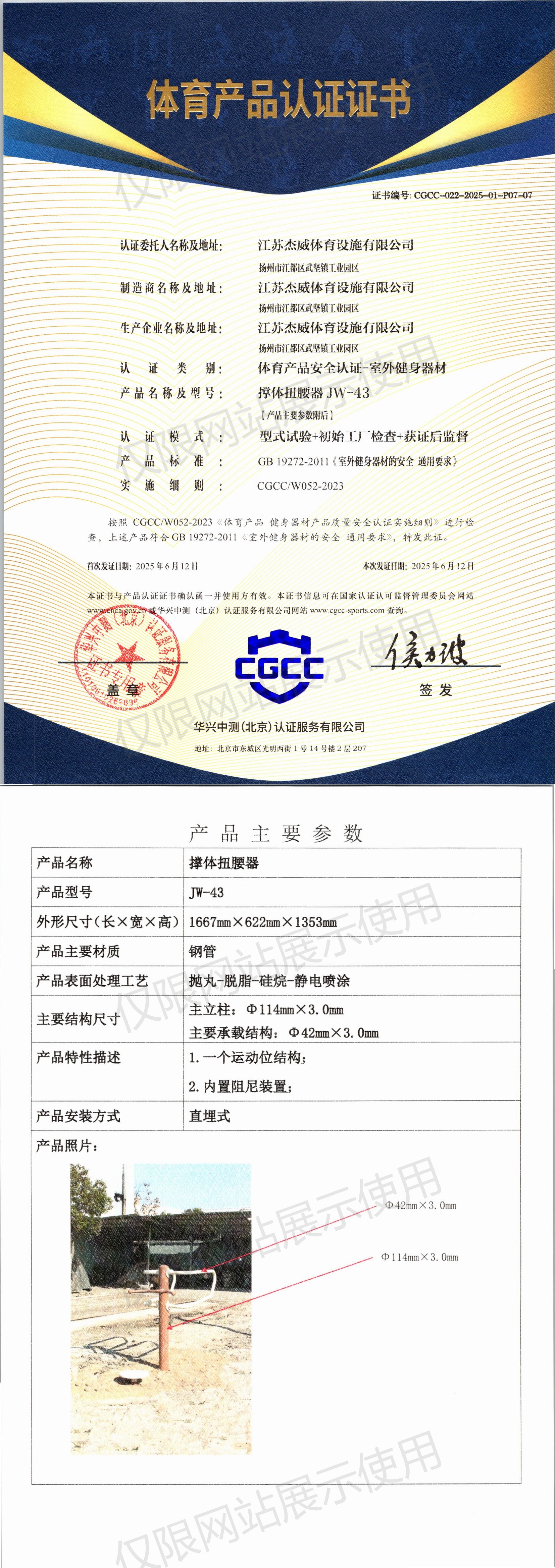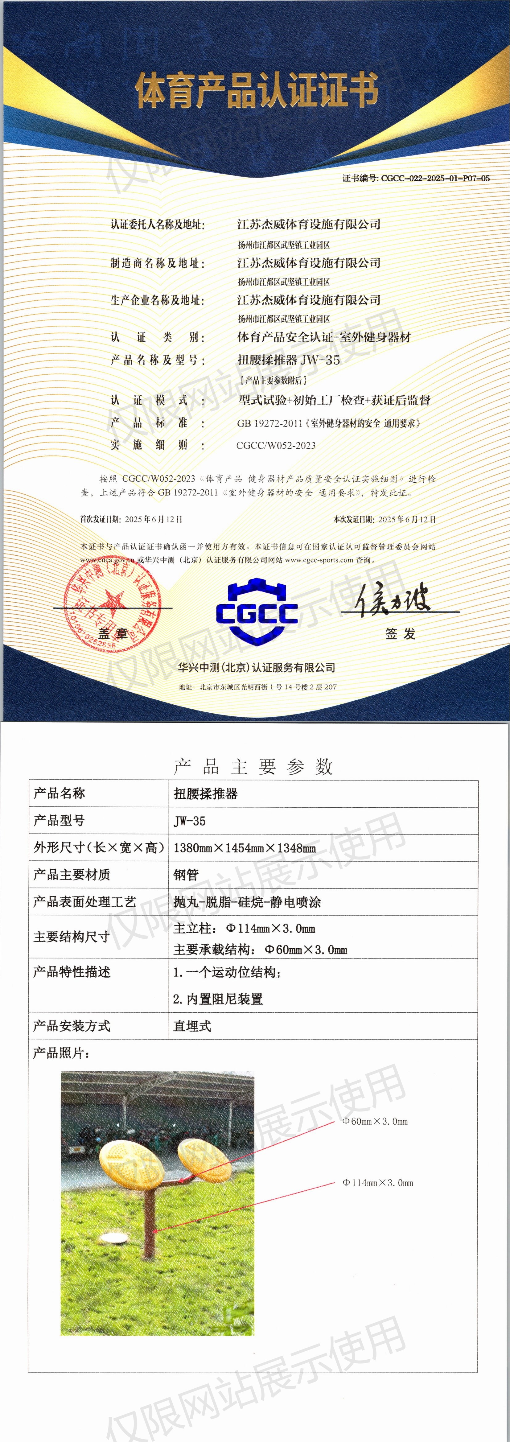 | 3 | 江苏杰威体育设施有限公司 | CGCC-022-2025-01-P07-05 | 扭腰揉推器 | JW-35 | 扬州市江都区武坚镇工业园区 | GB 19272-2011 | 2025-06-12 | 有效 | 查看 |