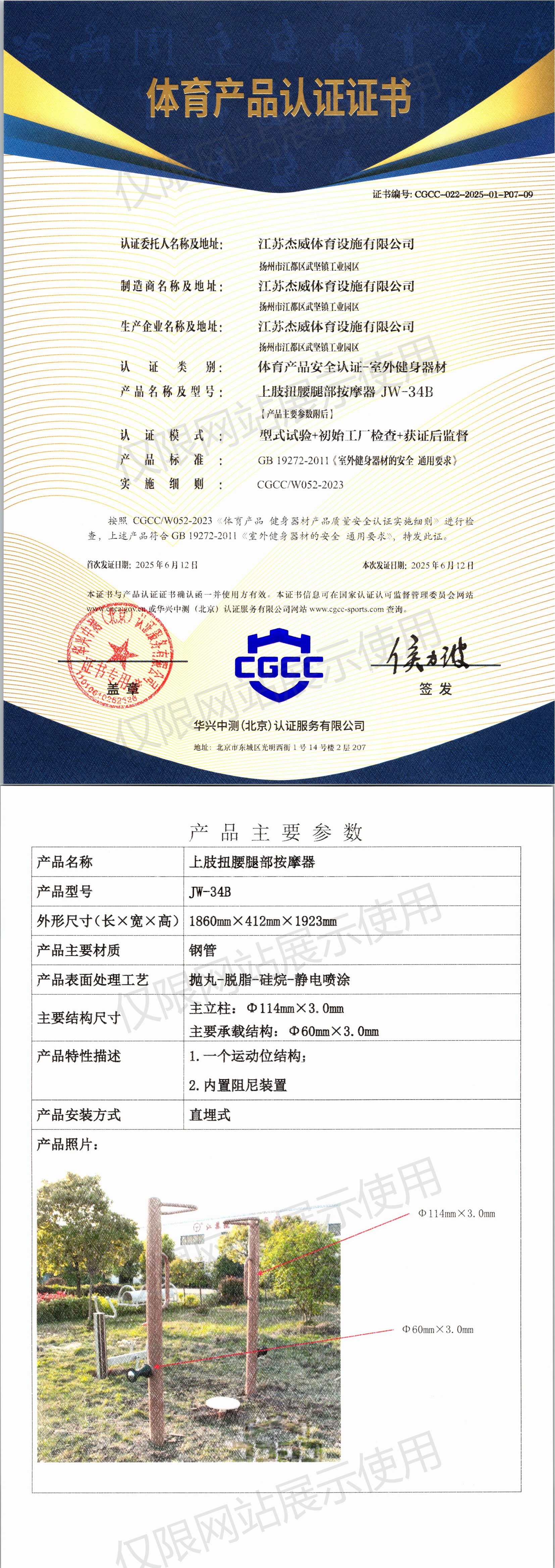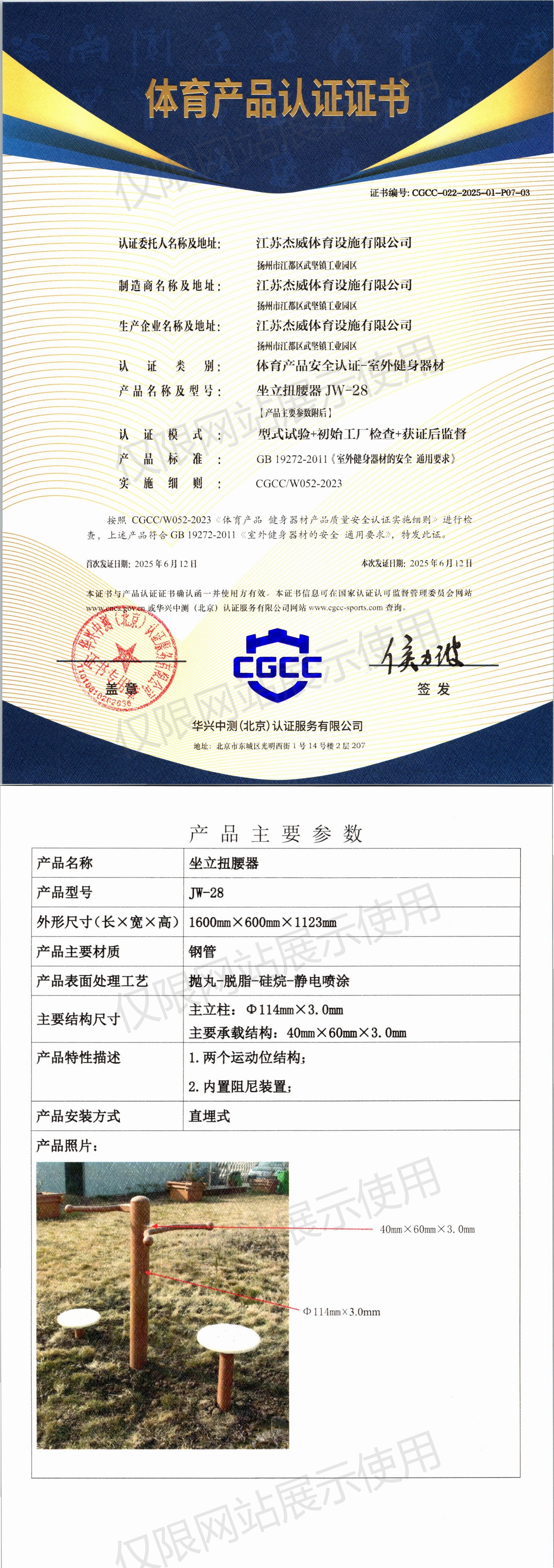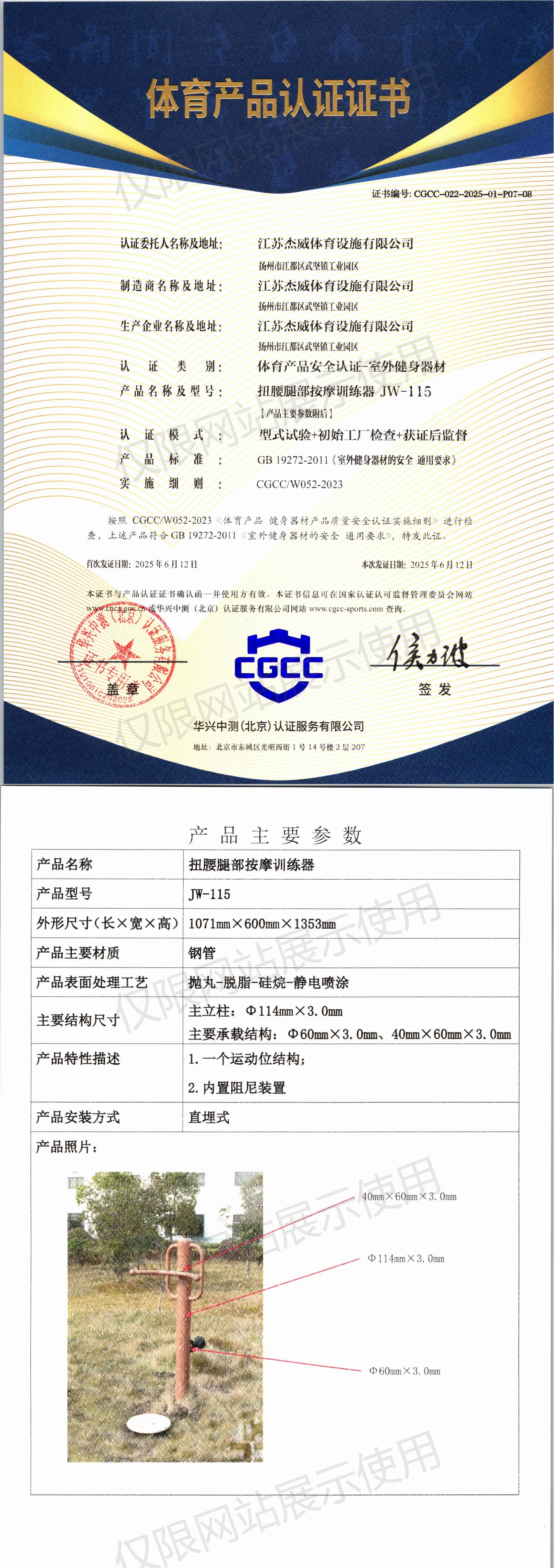 | 3 | 江苏杰威体育设施有限公司 | CGCC-022-2025-01-P07-05 | 扭腰揉推器 | JW-35 | 扬州市江都区武坚镇工业园区 | GB 19272-2011 | 2025-06-12 | 有效 | 查看 |