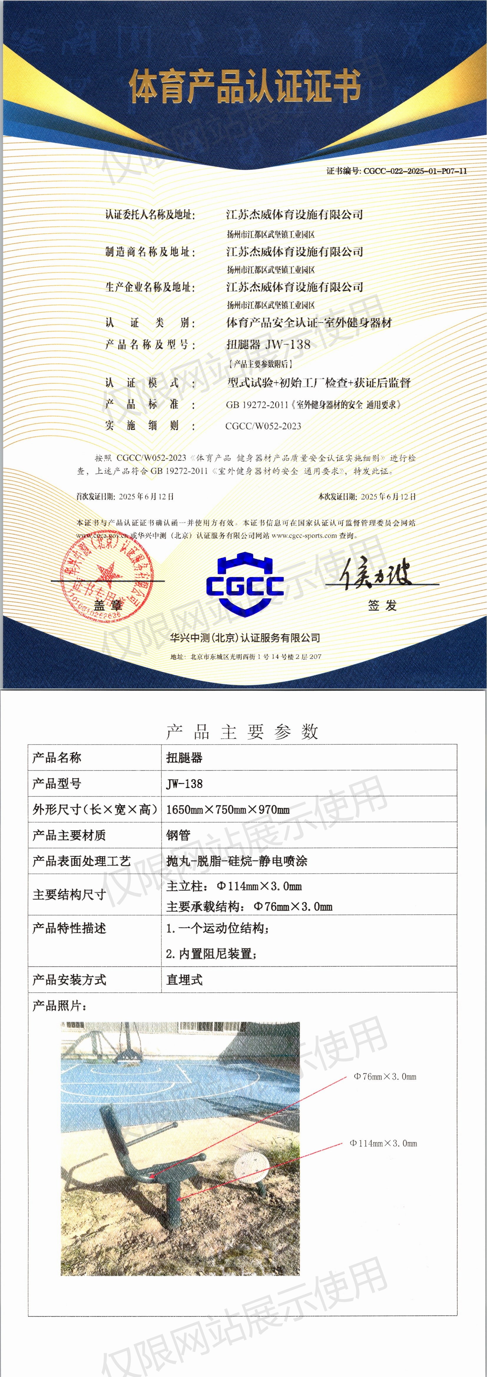 | 9 | 江苏杰威体育设施有限公司 | CGCC-022-2025-01-P07-11 | 扭腿器 | JW-138 | 扬州市江都区武坚镇工业园区 | GB 19272-2011 | 2025-06-12 | 有效 | 查看 |