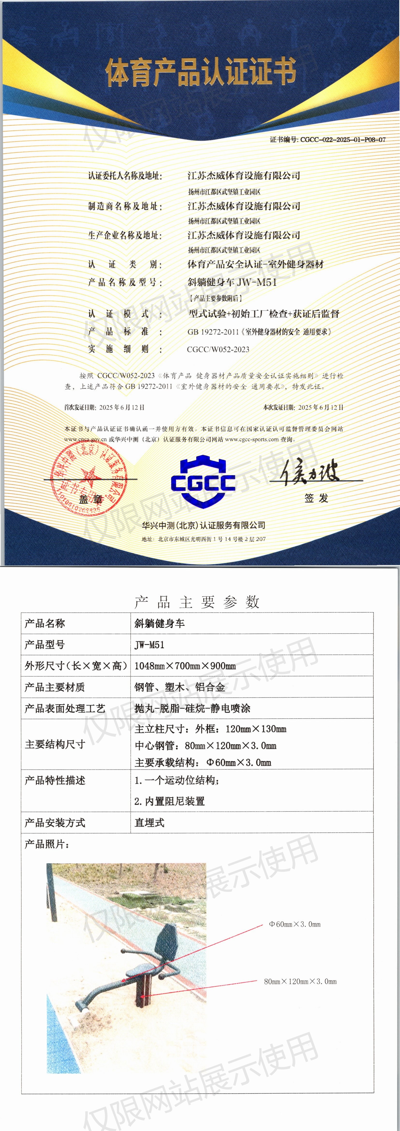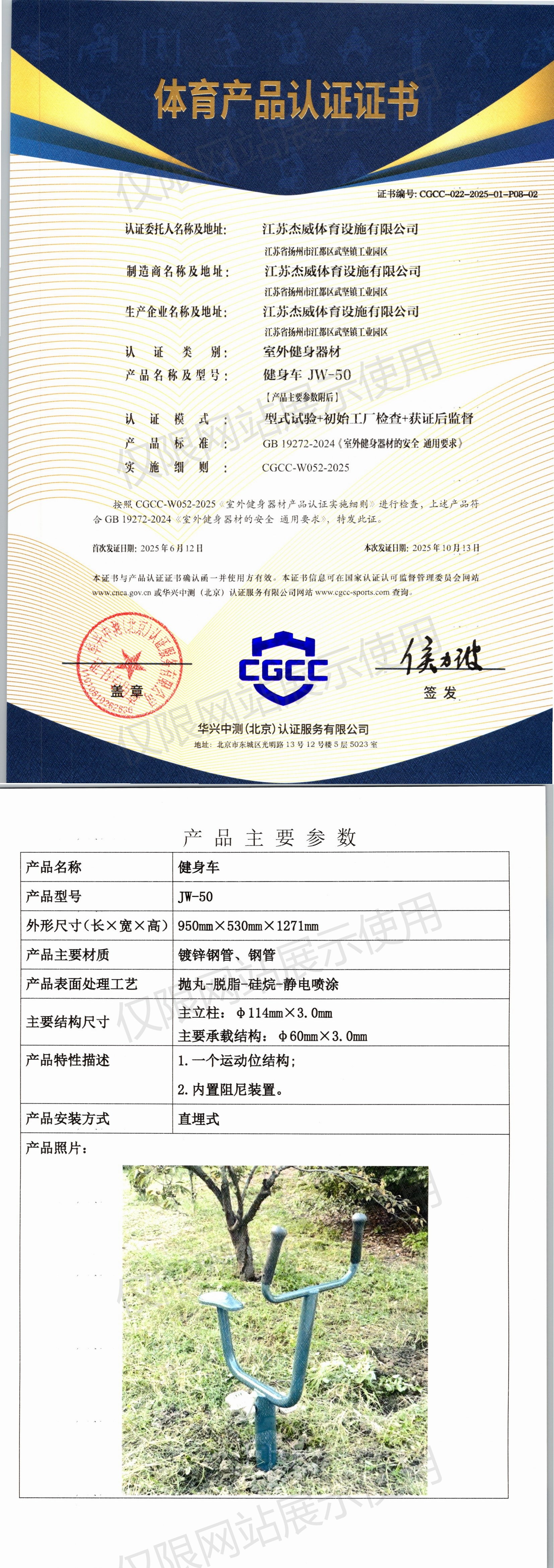 | 4 | 江苏杰威体育设施有限公司 | CGCC-022-2025-01-P08-02 | 健身车 | JW-50 | 江苏省扬州市江都区武坚镇工业园区 | GB 19272-2024 | 2025-06-12 | 有效 | 查看 |