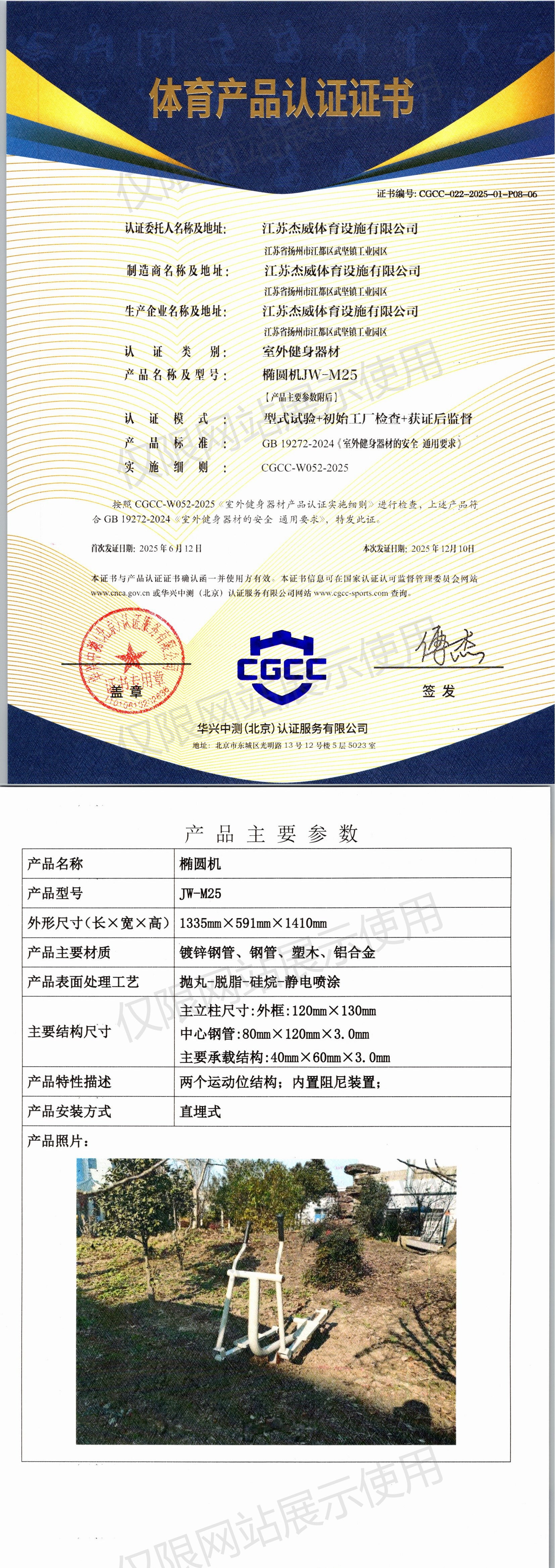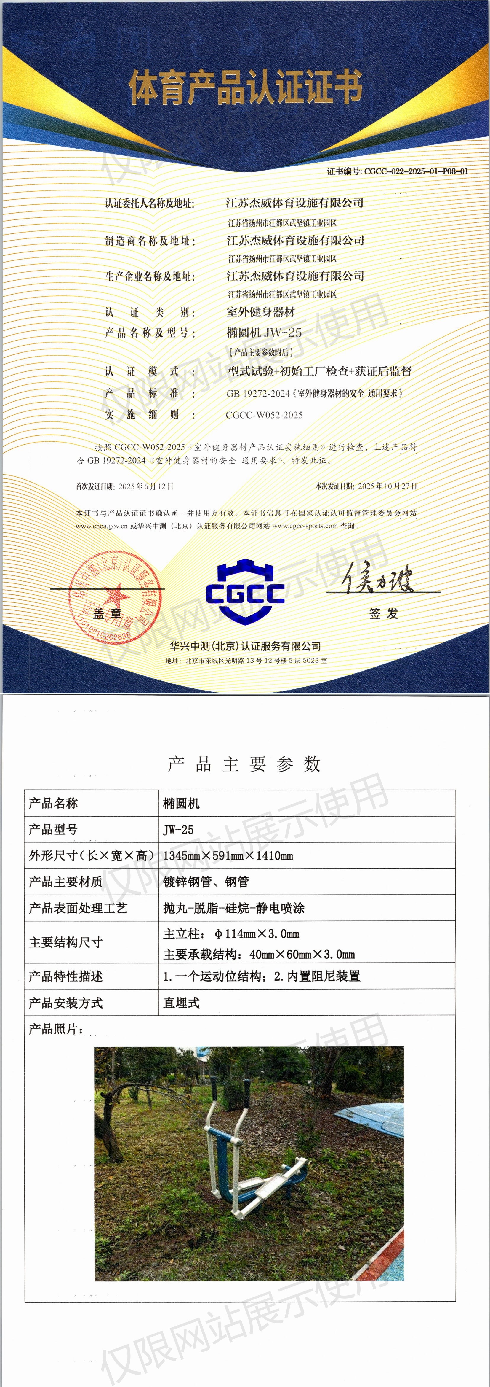 | 3 | 江苏杰威体育设施有限公司 | CGCC-022-2025-01-P08-01 | 椭圆机 | JW-25 | 江苏省扬州市江都区武坚镇工业园区 | GB 19272-2024 | 2025-06-12 | 有效 | 查看 |