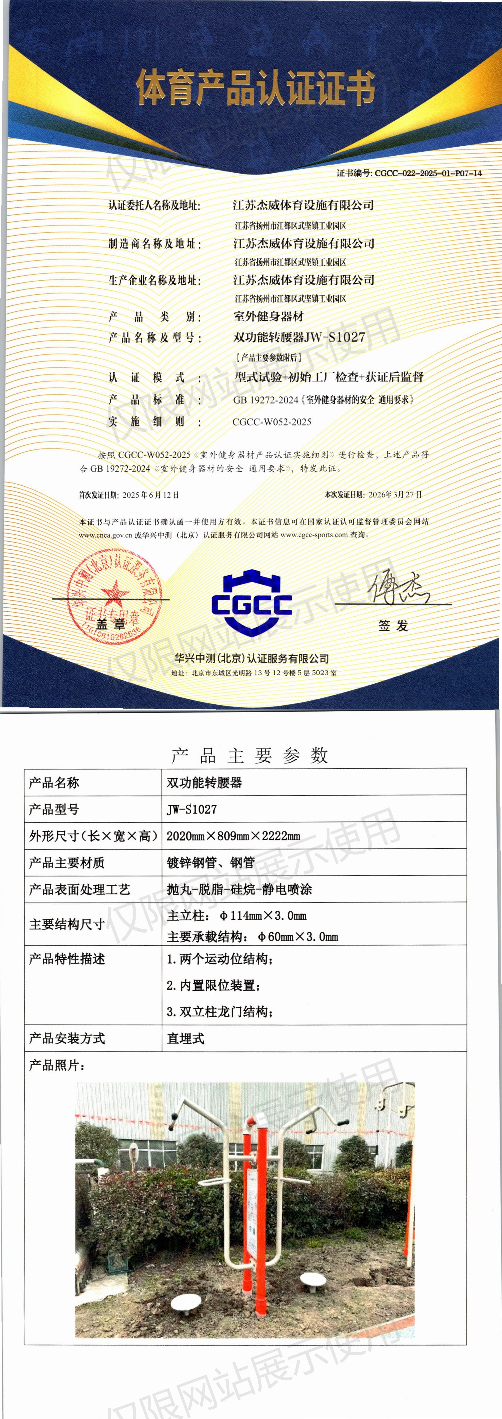 | 2 | 江苏杰威体育设施有限公司 | CGCC-022-2025-01-P07-14 | 双功能转腰器 | JW-S1027 | 扬州市江都区武坚镇工业园区 | GB 19272-2024 | 2025-06-12 | 有效 | 查看 |