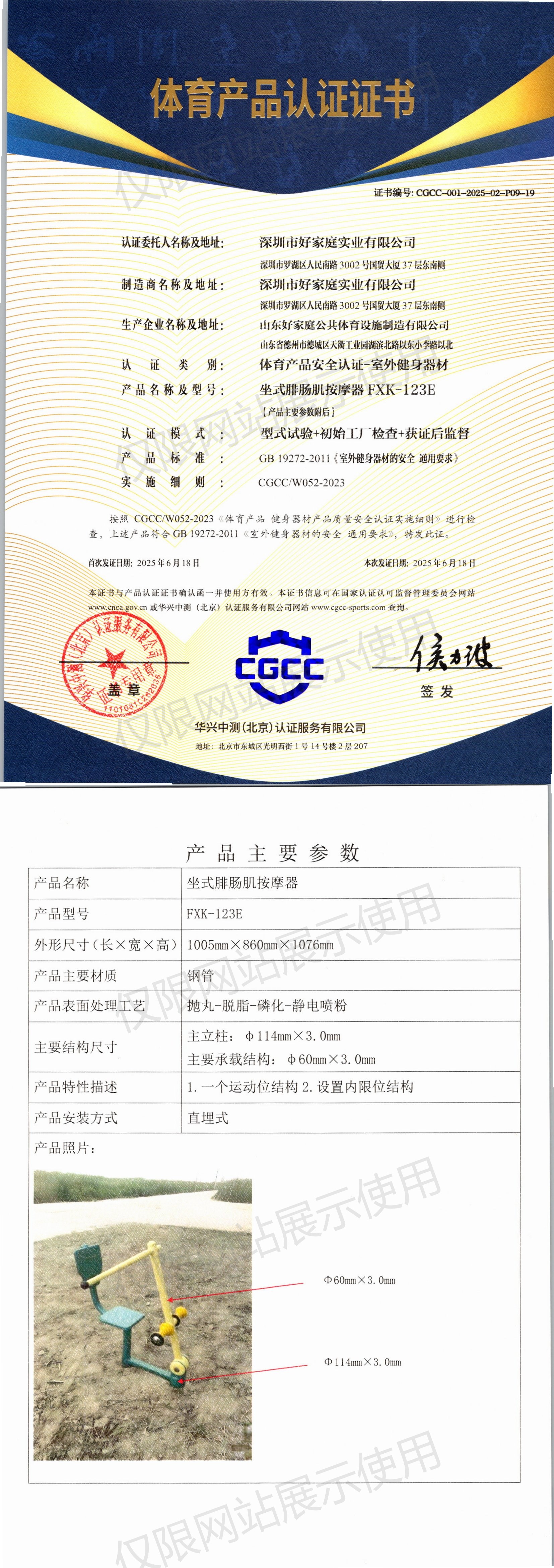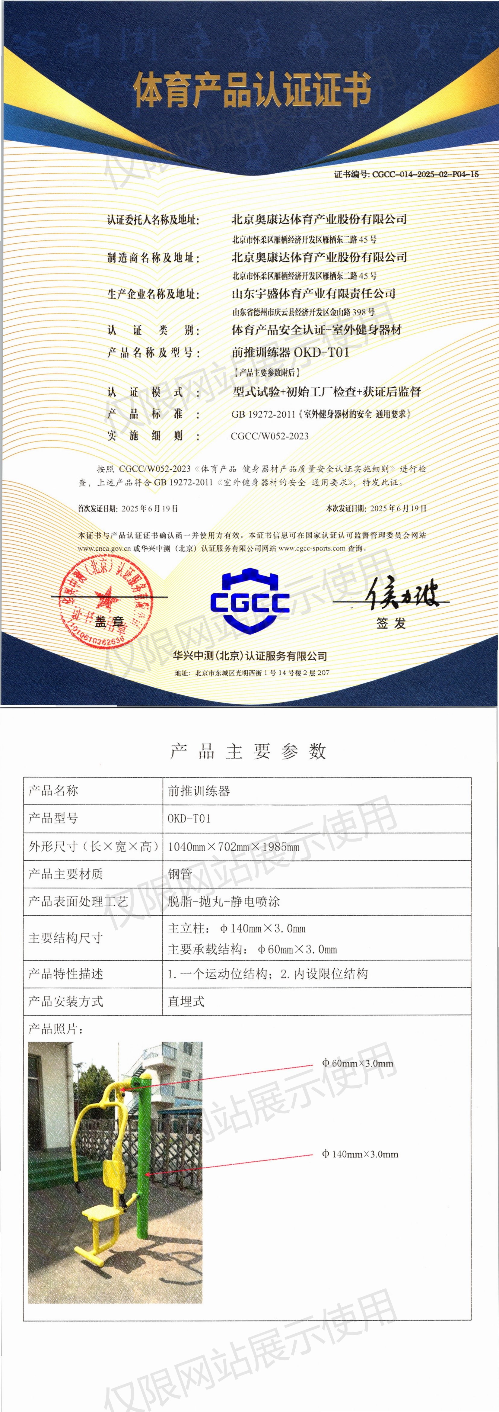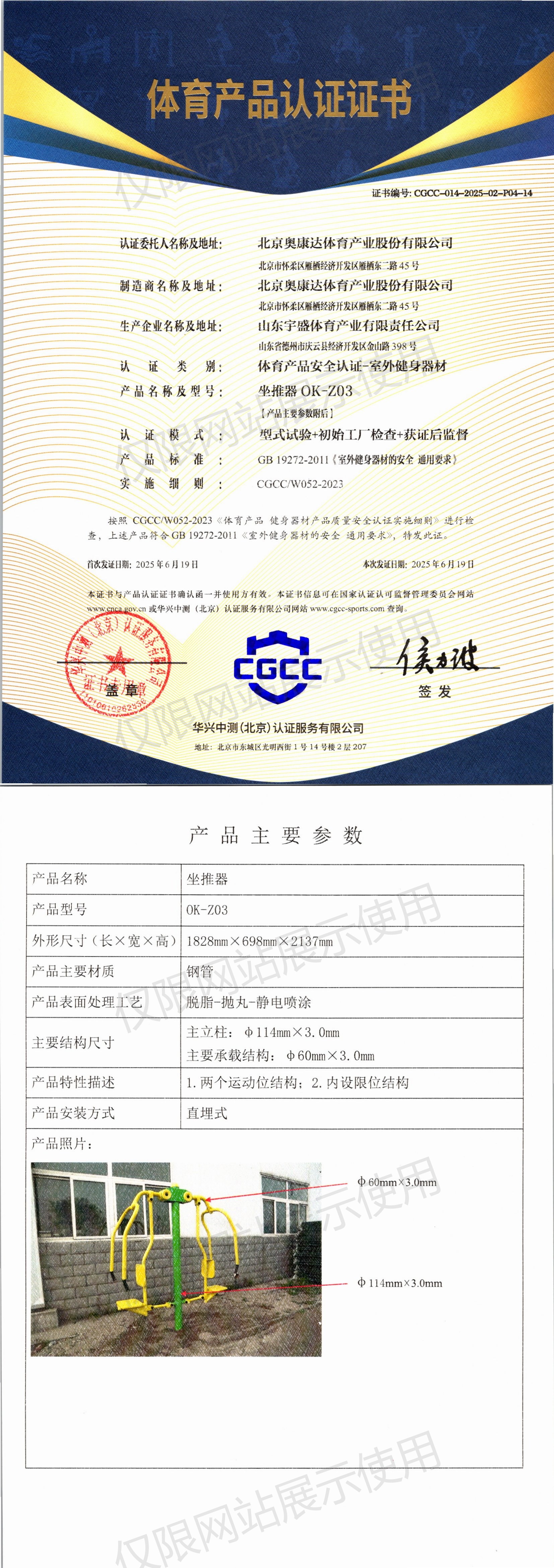 | 8 | 北京奥康达体育产业股份有限公司 | CGCC-014-2025-02-P04-14 | 坐推器 | OK-Z03 | 山东省德州市庆云县经济开发区金山路398号 | GB 19272-2011 | 2025-06-19 | 有效 | 查看 |