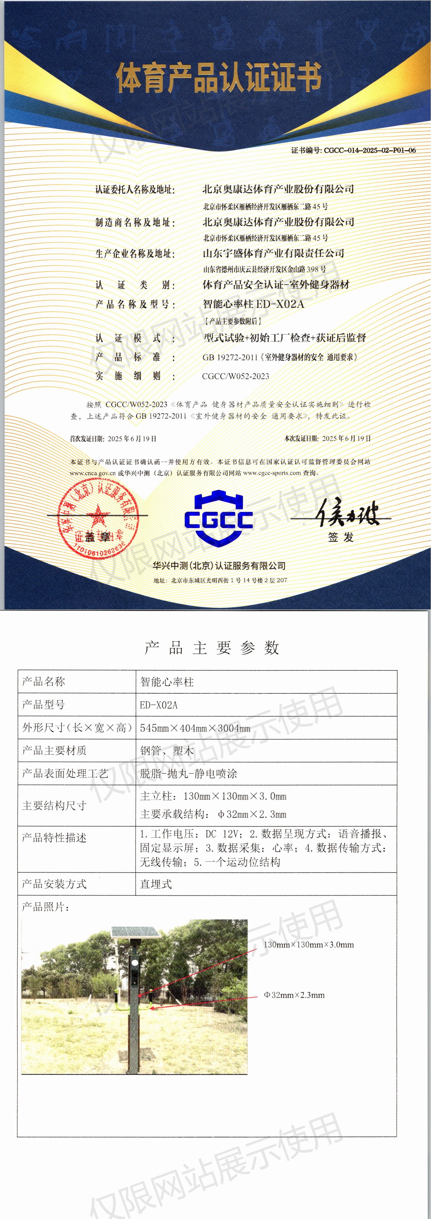 | 7 | 北京奥康达体育产业股份有限公司 | CGCC-014-2025-02-P01-06 | 智能心率柱 | ED-X02A | 山东省德州市庆云县经济开发区金山路398号 | GB 19272-2011 | 2025-06-19 | 有效 | 查看 |