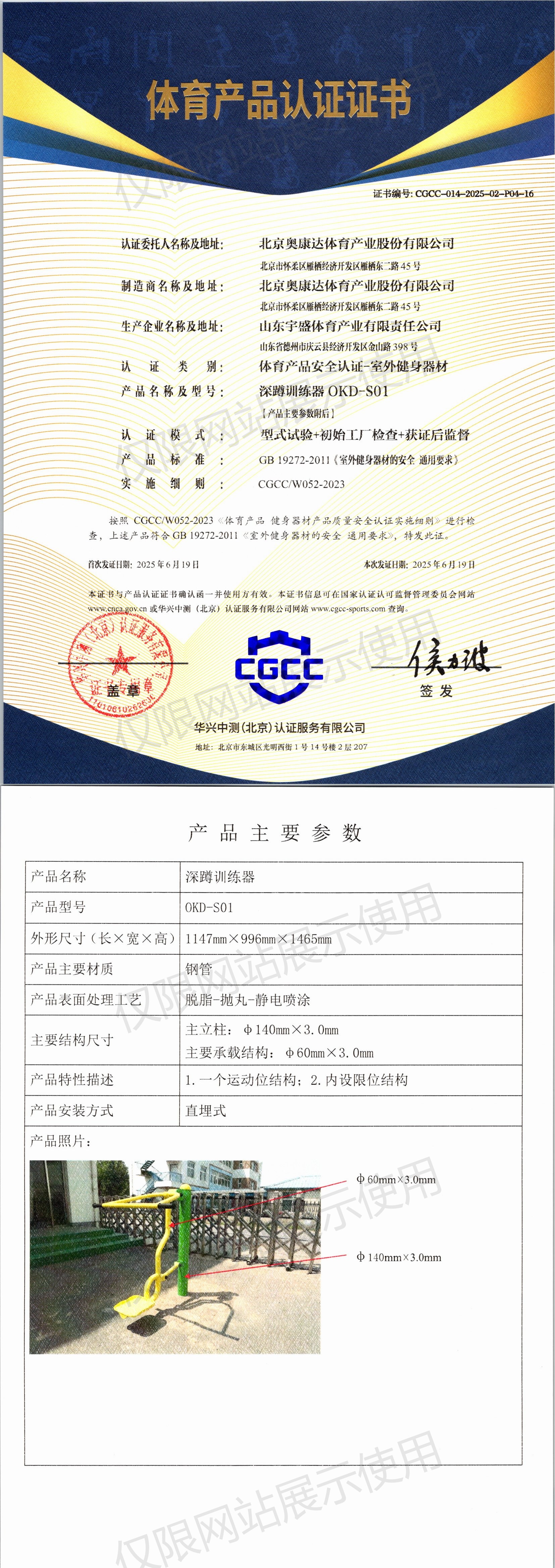| 10 | 北京奥康达体育产业股份有限公司 | CGCC-014-2025-02-P04-16 | 深蹲训练器 | OKD-S01 | 山东省德州市庆云县经济开发区金山路398号 | GB 19272-2011 | 2025-06-19 | 有效 | 查看 |