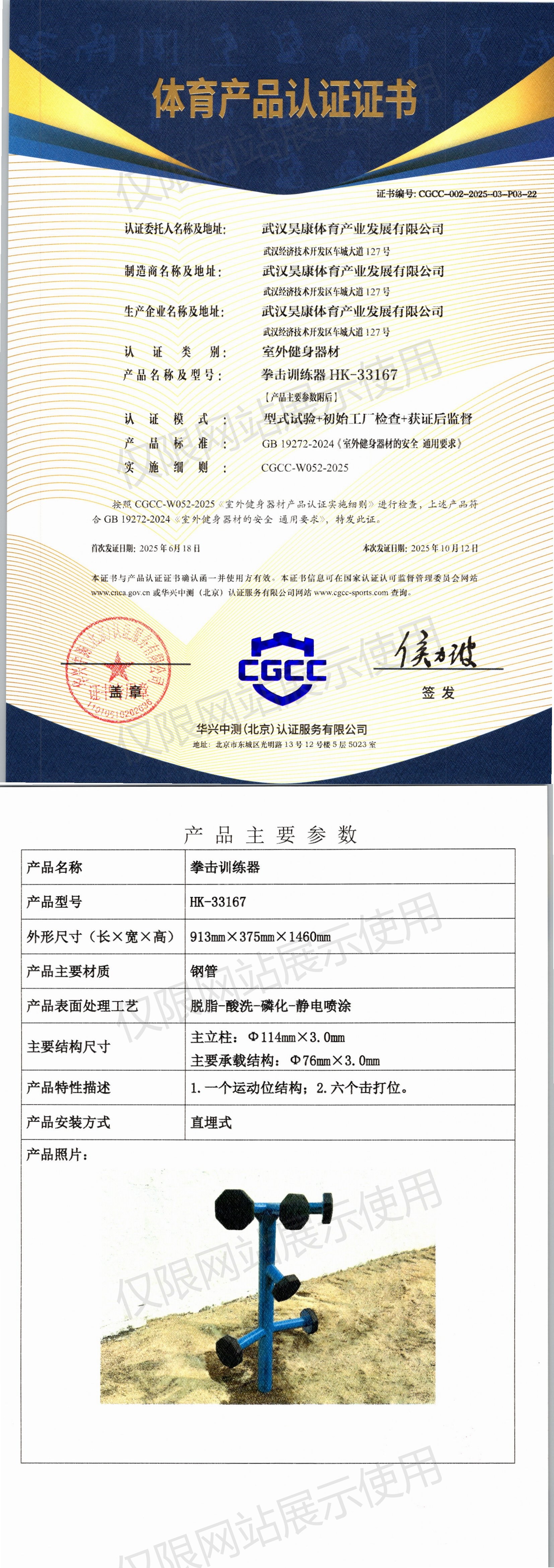 | 5 | 武汉昊康体育产业发展有限公司 | CGCC-002-2025-03-P03-22 | 拳击训练器 | HK-33167 | 武汉经济技术开发区车城大道127号 | GB 19272-2024 | 2025-06-18 | 有效 | 查看 |