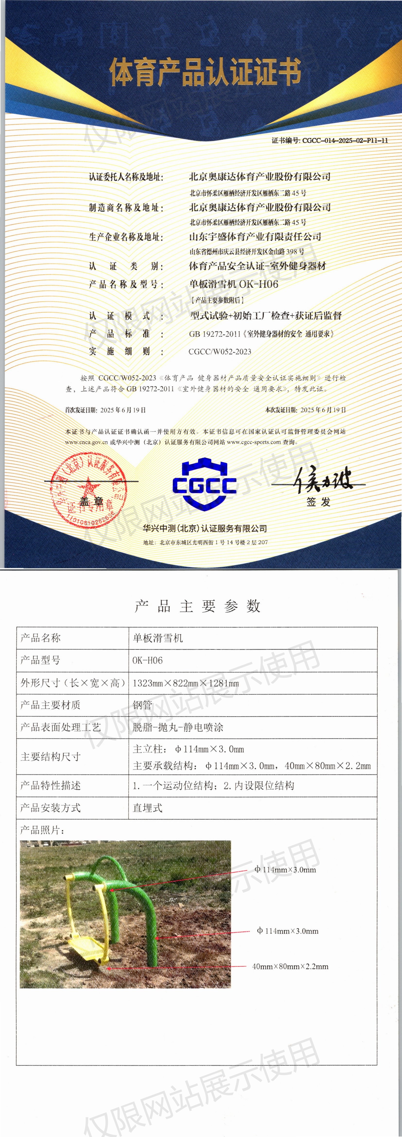 | 10 | 北京奥康达体育产业股份有限公司 | CGCC-014-2025-02-P11-11 | 单板滑雪机 | OK-H06 | 山东省德州市庆云县经济开发区金山路398号 | GB 19272-2011 | 2025-06-19 | 有效 | 查看 |