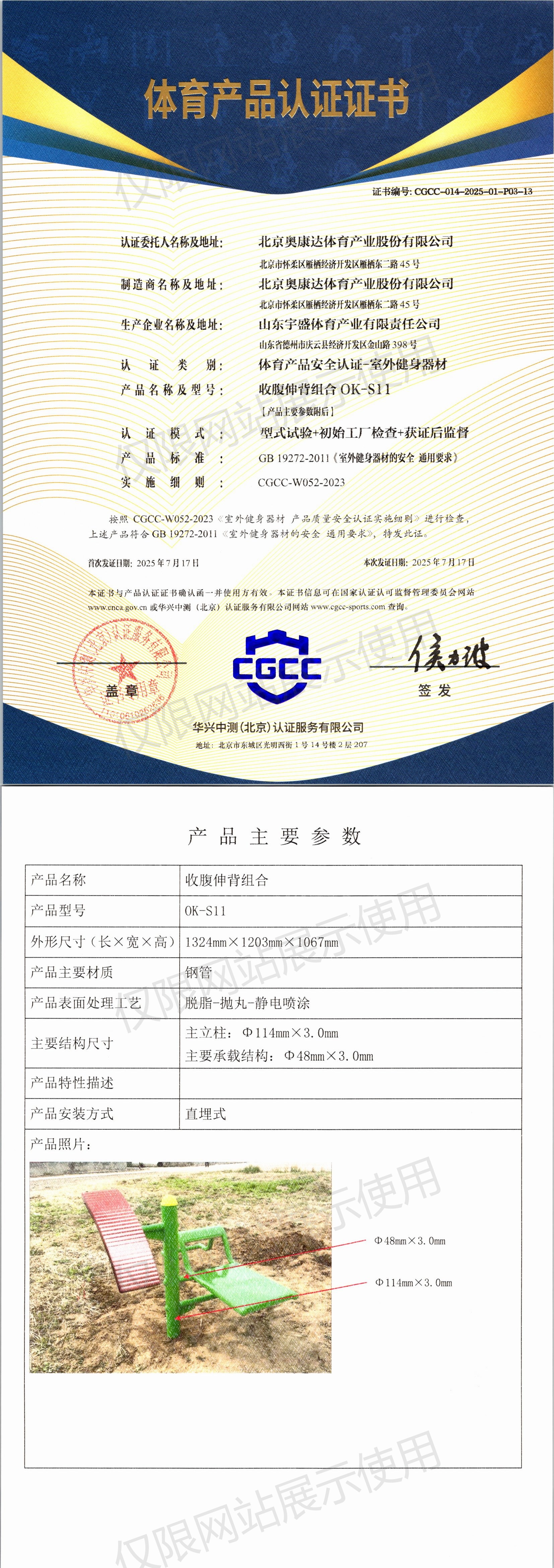 | 1 | 北京奥康达体育产业股份有限公司 | CGCC-014-2025-01-P03-13 | 收腹伸背组合 | OK-S11 | 北京市怀柔区雁栖经济开发区雁栖东二路45号 | GB 19272-2011 | 2025-07-17 | 有效 | 查看 |