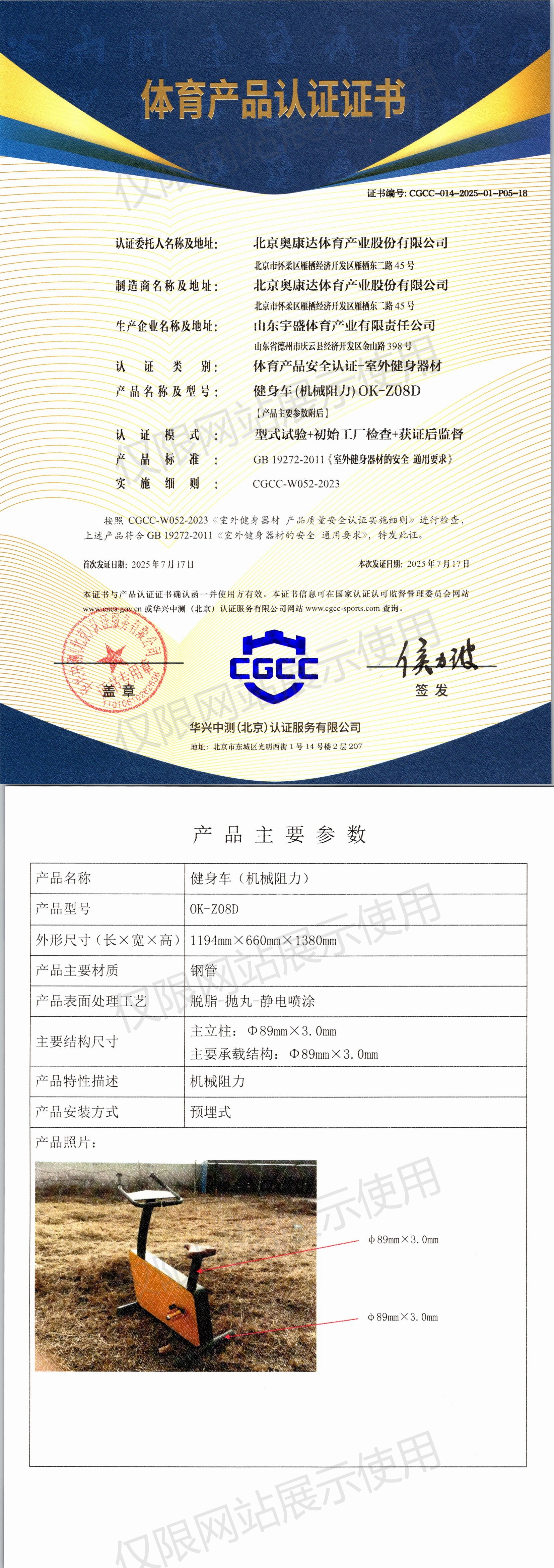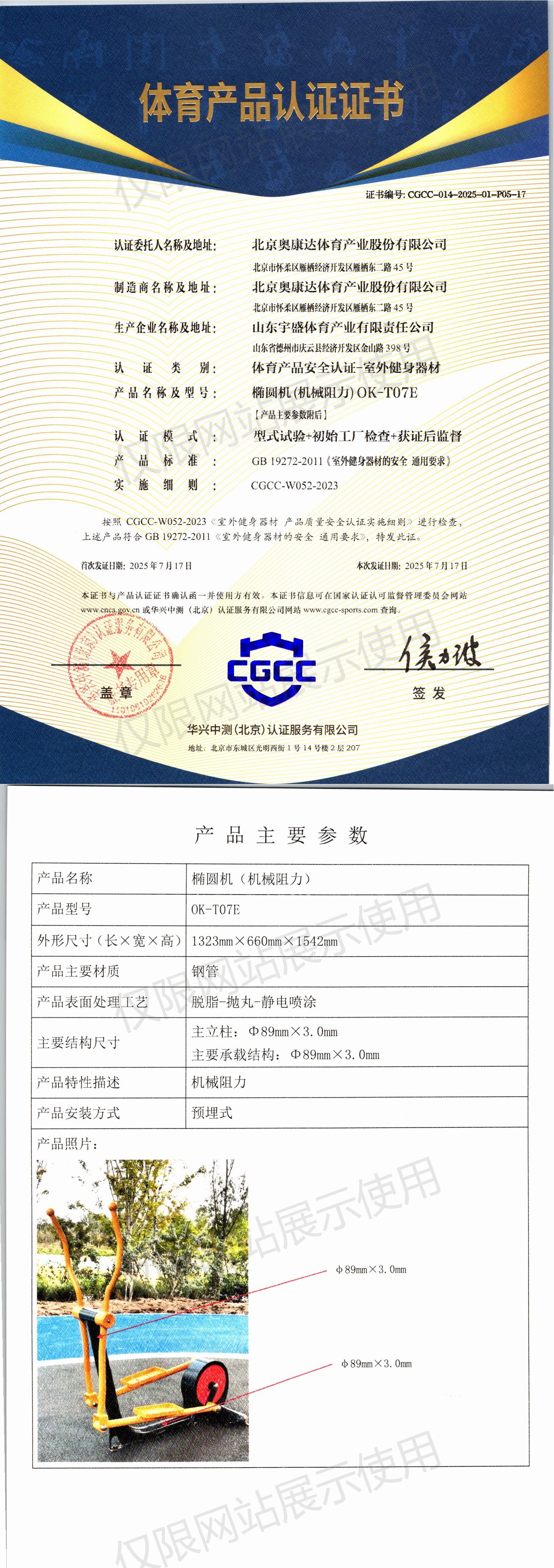 | 2 | 北京奥康达体育产业股份有限公司 | CGCC-014-2025-01-P05-17 | 椭圆机(机械阻力) | OK-T07E | 北京市怀柔区雁栖经济开发区雁栖东二路45号 | GB 19272-2011 | 2025-07-17 | 有效 | 查看 |