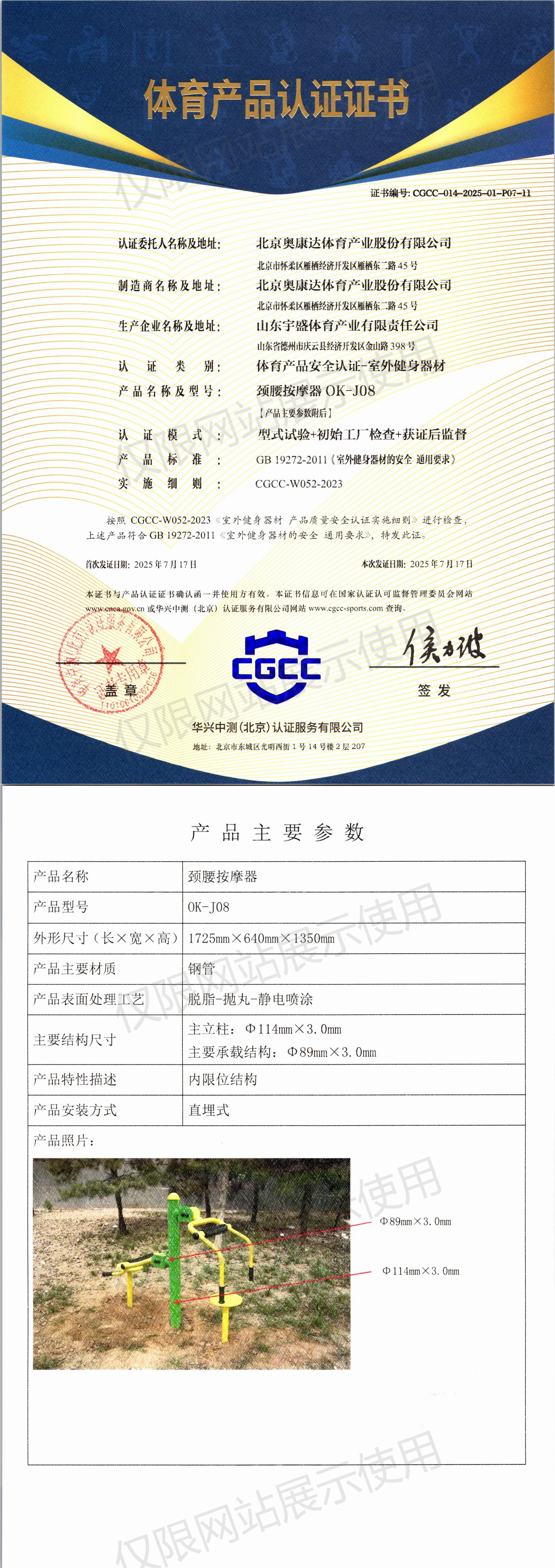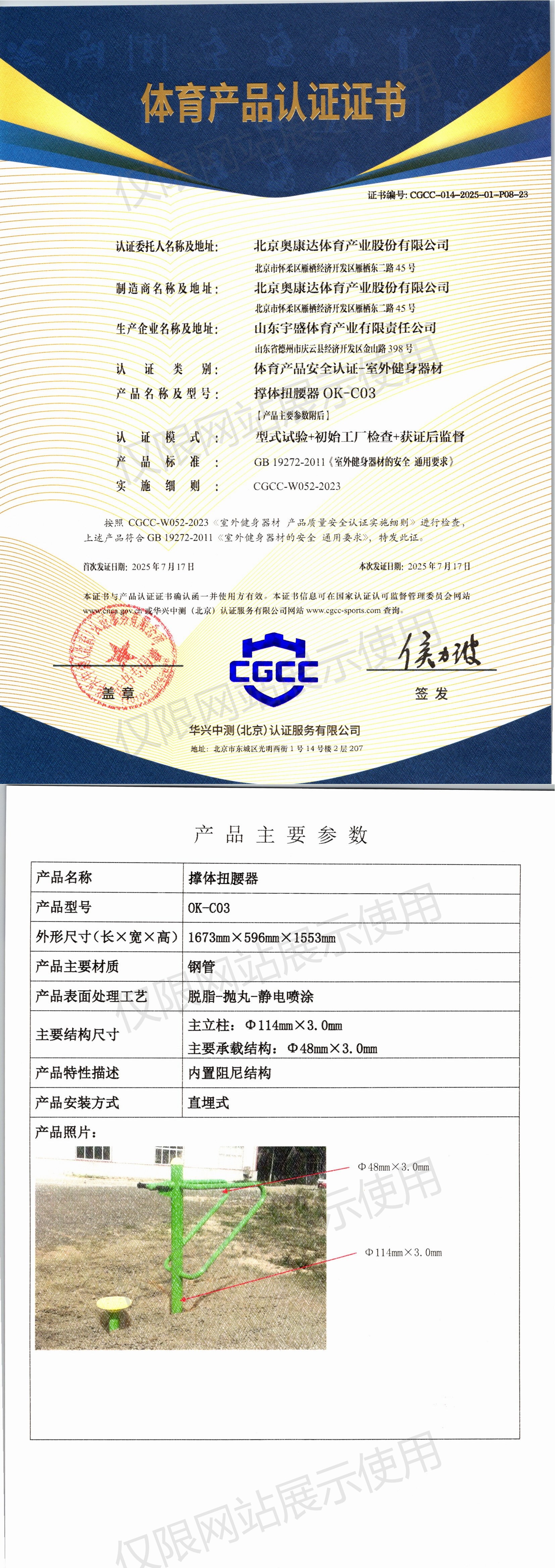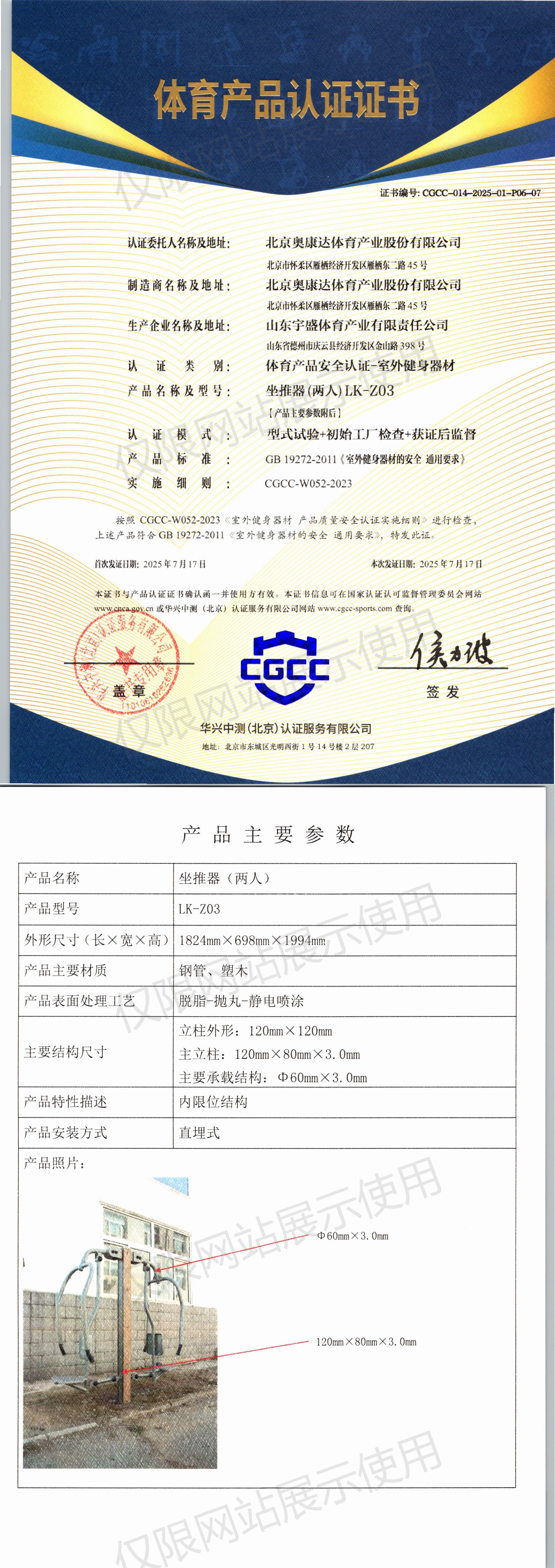 | 4 | 北京奥康达体育产业股份有限公司 | CGCC-014-2025-01-P06-07 | 坐推器(两人) | LK-Z03 | 北京市怀柔区雁栖经济开发区雁栖东二路45号 | GB 19272-2011 | 2025-07-17 | 有效 | 查看 |