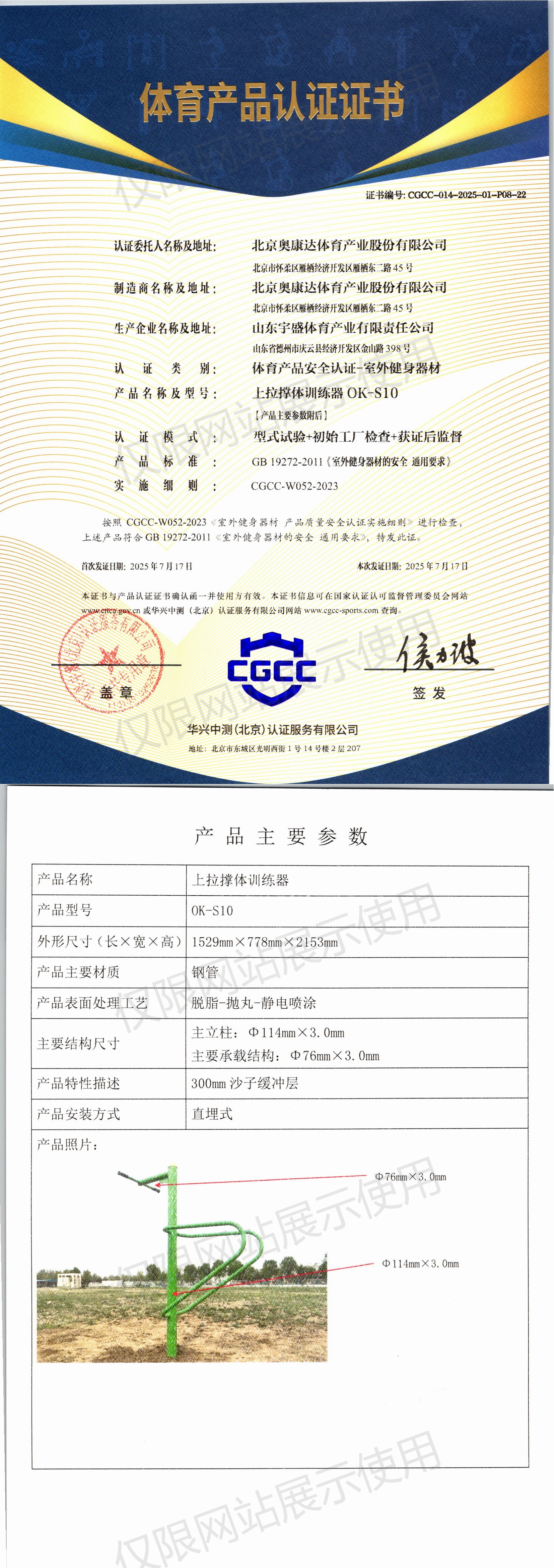 | 10 | 北京奥康达体育产业股份有限公司 | CGCC-014-2025-01-P08-25 | 肋木单杠组合 | OK-L02C | 北京市怀柔区雁栖经济开发区雁栖东二路45号 | GB 19272-2011 | 2025-07-17 | 有效 | 查看 |