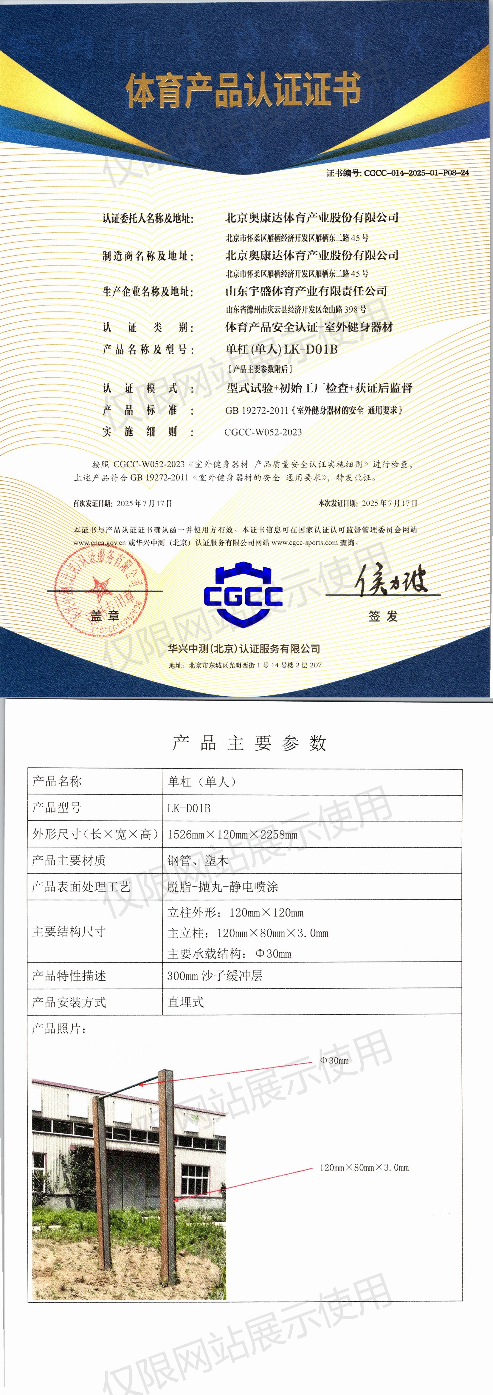 | 9 | 北京奥康达体育产业股份有限公司 | CGCC-014-2025-01-P08-24 | 单杠(单人) | LK-D01B | 北京市怀柔区雁栖经济开发区雁栖东二路45号 | GB 19272-2011 | 2025-07-17 | 有效 | 查看 |