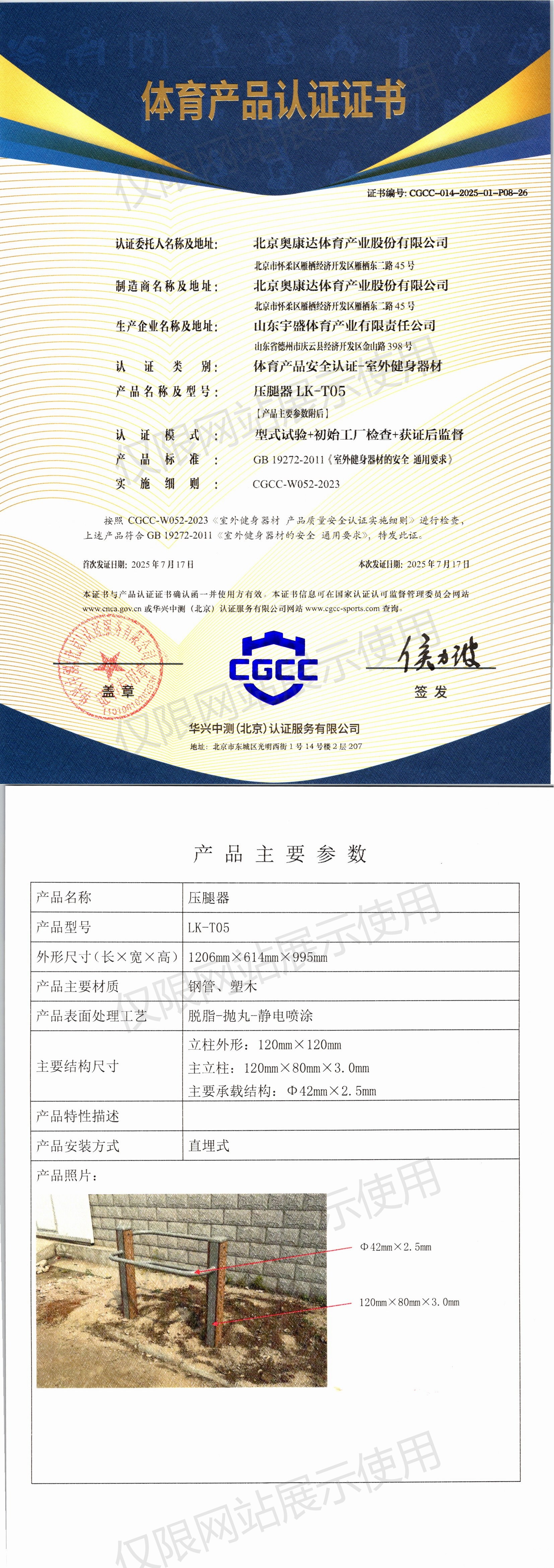 | 1 | 北京奥康达体育产业股份有限公司 | CGCC-014-2025-01-P08-26 | 压腿器 | LK-T05 | 北京市怀柔区雁栖经济开发区雁栖东二路45号 | GB 19272-2011 | 2025-07-17 | 有效 | 查看 |