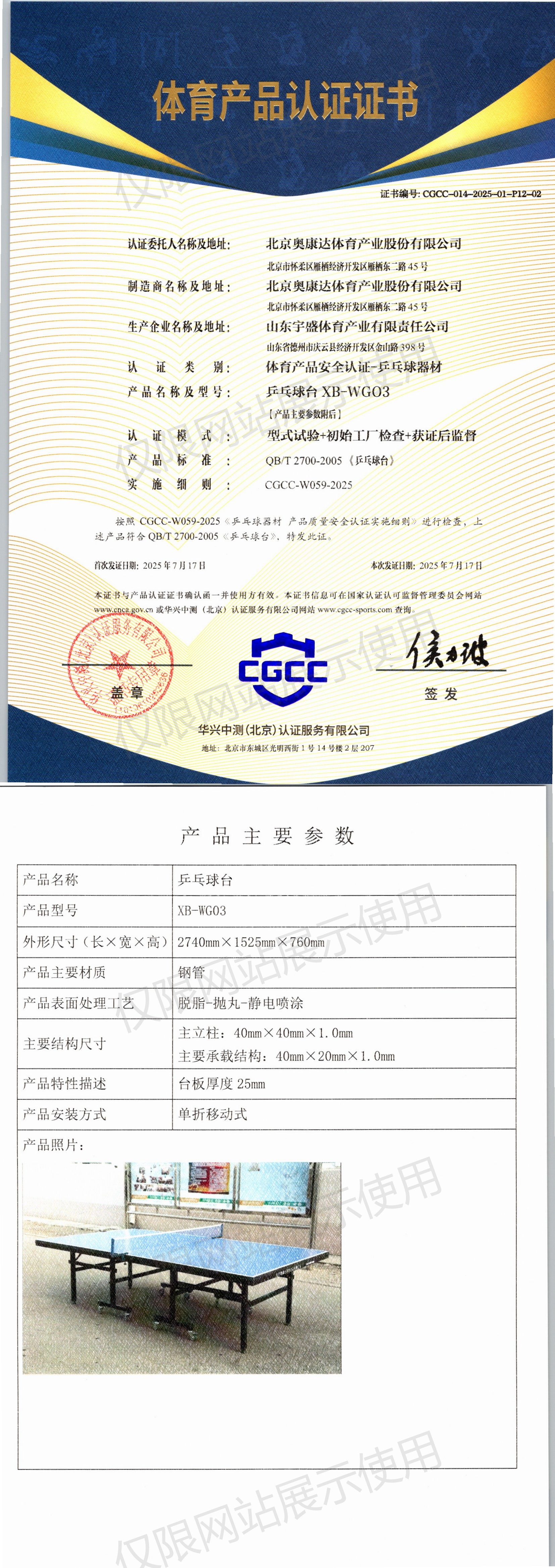 | 3 | 北京奥康达体育产业股份有限公司 | CGCC-014-2025-01-P12-02 | 乒乓球台 | XB-WGO3 | 北京市怀柔区雁栖经济开发区雁栖东二路45号 | QB/T 2700-2005 | 2025-07-17 | 有效 | 查看 |
