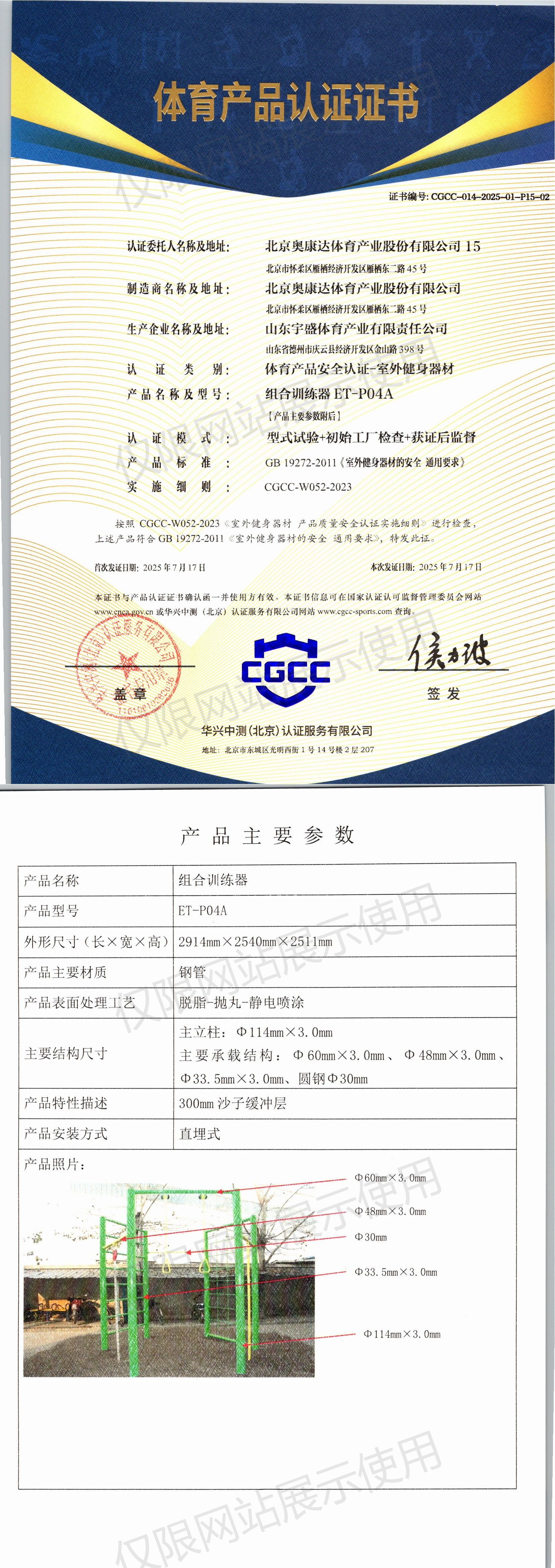 | 4 | 北京奥康达体育产业股份有限公司 | CGCC-014-2025-01-P15-02 | 组合训练器 | ET-P04A | 北京市怀柔区雁栖经济开发区雁栖东二路45号 | GB 19272-2011 | 2025-07-17 | 有效 | 查看 |