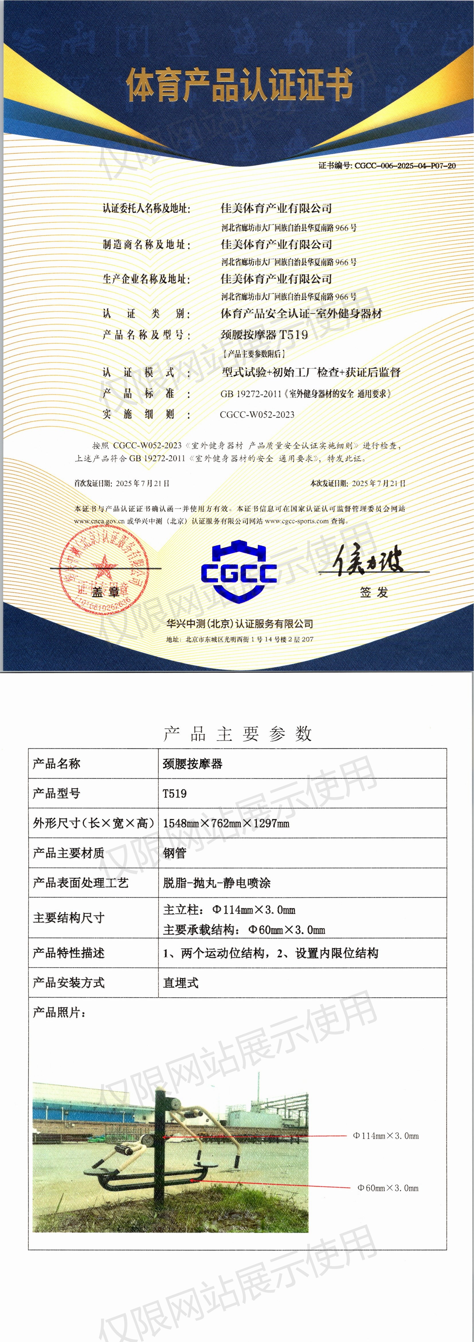 | 5 | 佳美体育产业有限公司 | CGCC-006-2025-04-P07-20 | 颈腰按摩器 | T519 | 河北省廊坊市大厂回族自治县华夏南路966号 | GB 19272-2011 | 2025-07-21 | 有效 | 查看 |