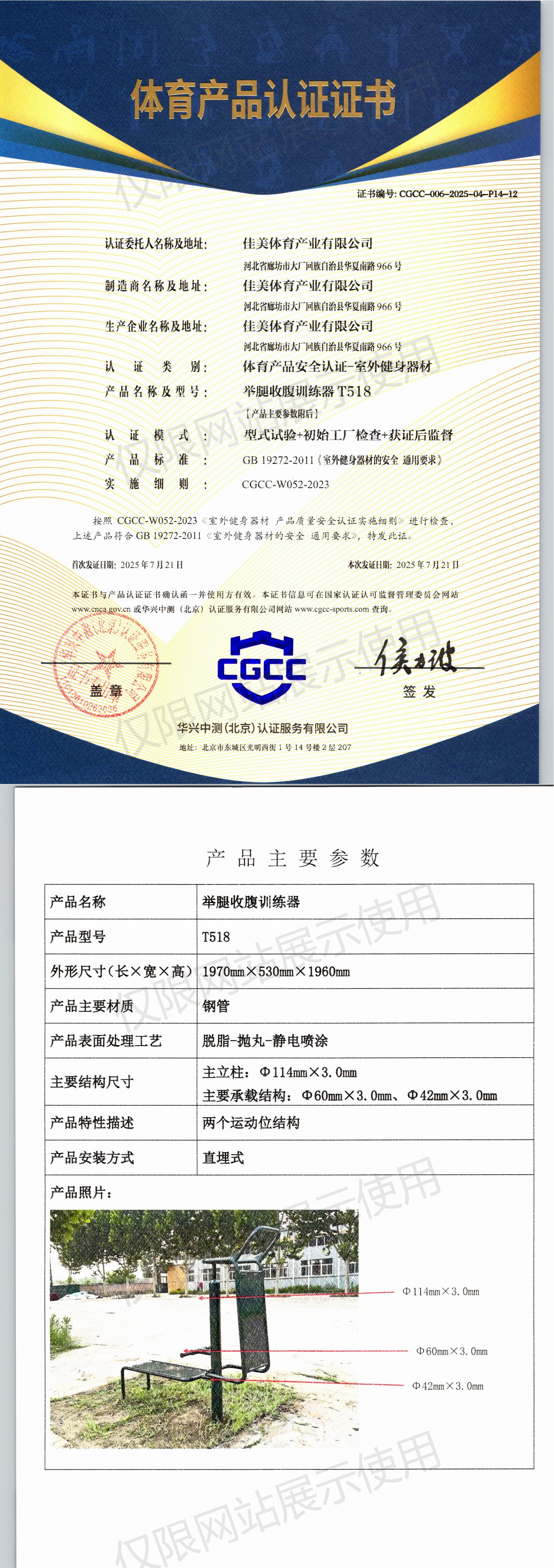| 6 | 佳美体育产业有限公司 | CGCC-006-2025-04-P14-12 | 举腿收腹训练器 | T518 | 河北省廊坊市大厂回族自治县华夏南路966号 | GB 19272-2011 | 2025-07-21 | 有效 | 查看 |