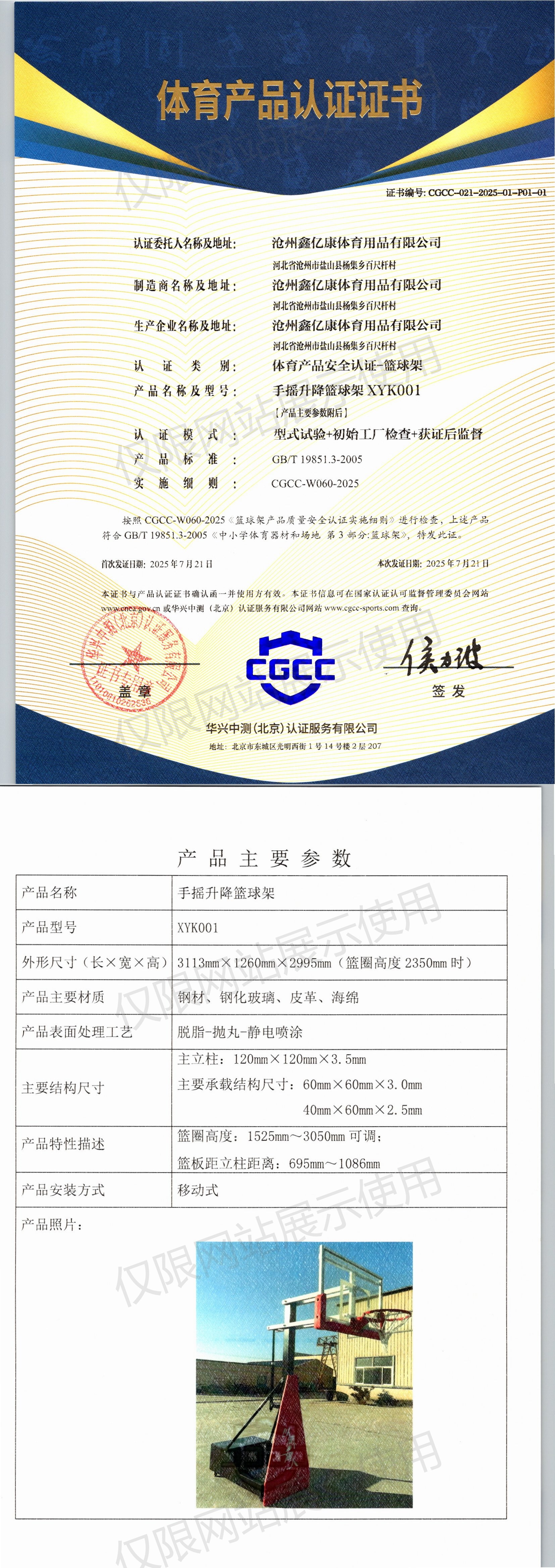 | 7 | 沧州鑫亿康体育用品有限公司 | CGCC-021-2025-01-P01-01 | 手摇升降篮球架 | XYK001 | 河北省沧州市盐山县杨集乡百尺杆村 | GB/T 19851.3-2005 | 2025-07-21 | 有效 | 查看 |