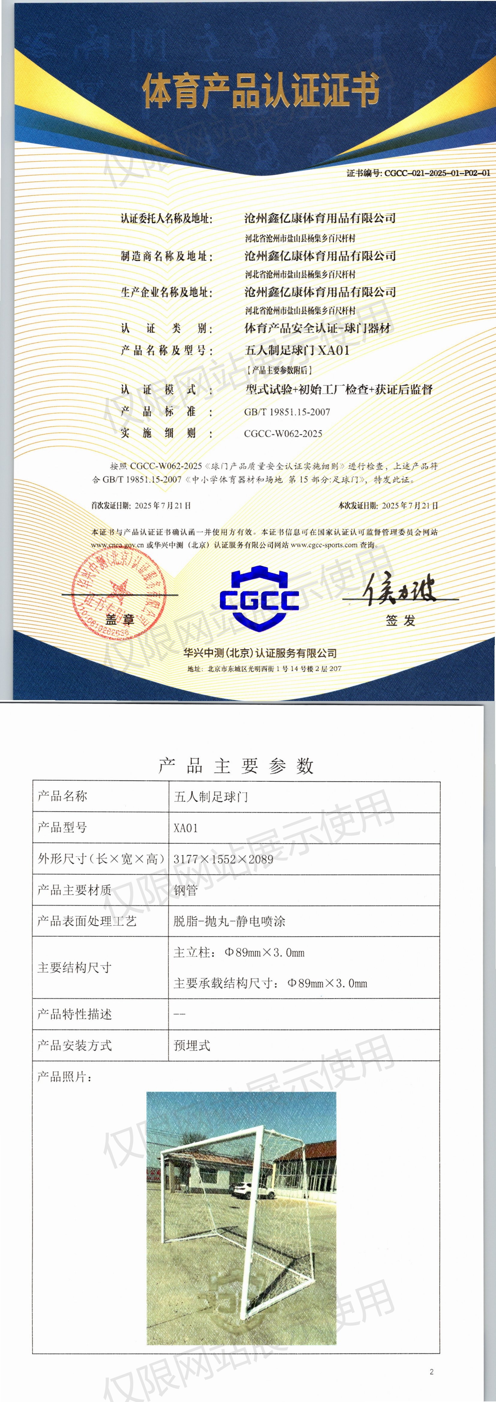 | 8 | 沧州鑫亿康体育用品有限公司 | CGCC-021-2025-01-P02-01 | 五人制足球门 | XA01 | 河北省沧州市盐山县杨集乡百尺杆村 | GB/T 19851.15-2007 | 2025-07-21 | 有效 | 查看 |