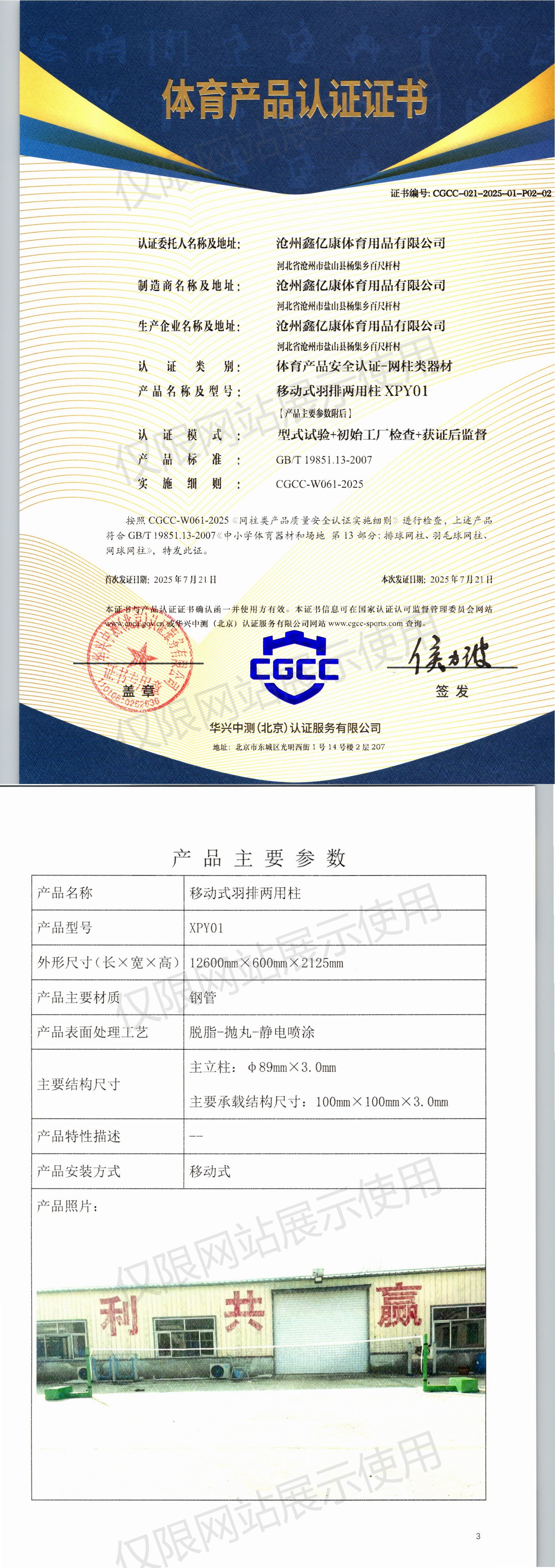 | 9 | 沧州鑫亿康体育用品有限公司 | CGCC-021-2025-01-P02-02 | 移动式羽排两用柱 | XPY01 | 河北省沧州市盐山县杨集乡百尺杆村 | GB/T 19851.13-2007 | 2025-07-21 | 有效 | 查看 |