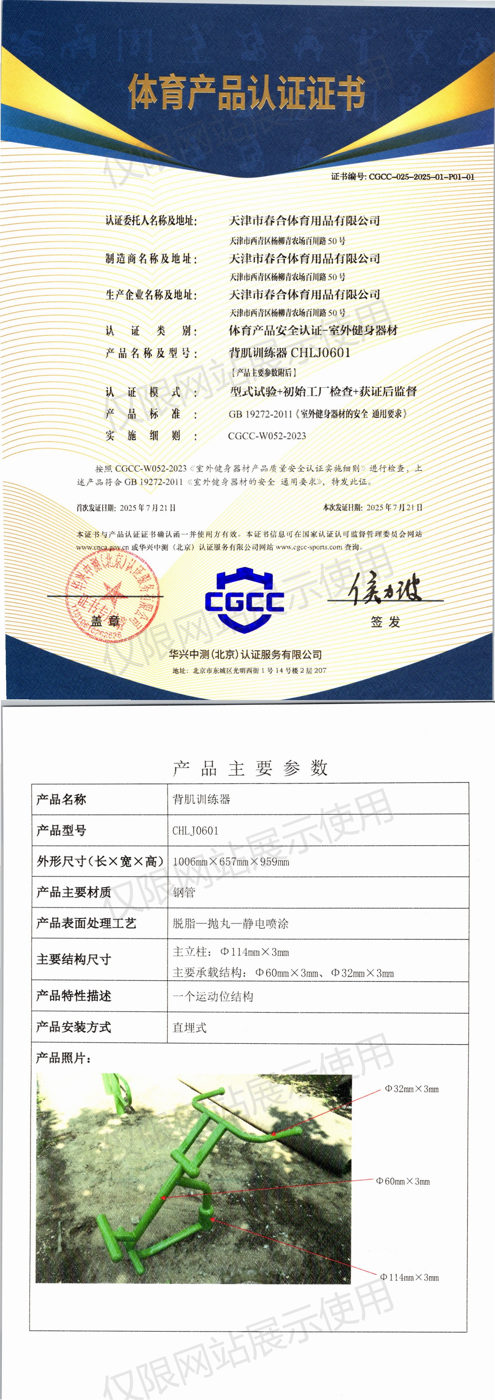 | 10 | 天津市春合体育用品有限公司 | CGCC-025-2025-01-P01-01 | 背肌训练器 | CHLJ0601 | 天津市西青区杨柳青农场百川路 50 号 | GB 19272-2011 | 2025-07-21 | 有效 | 查看 |