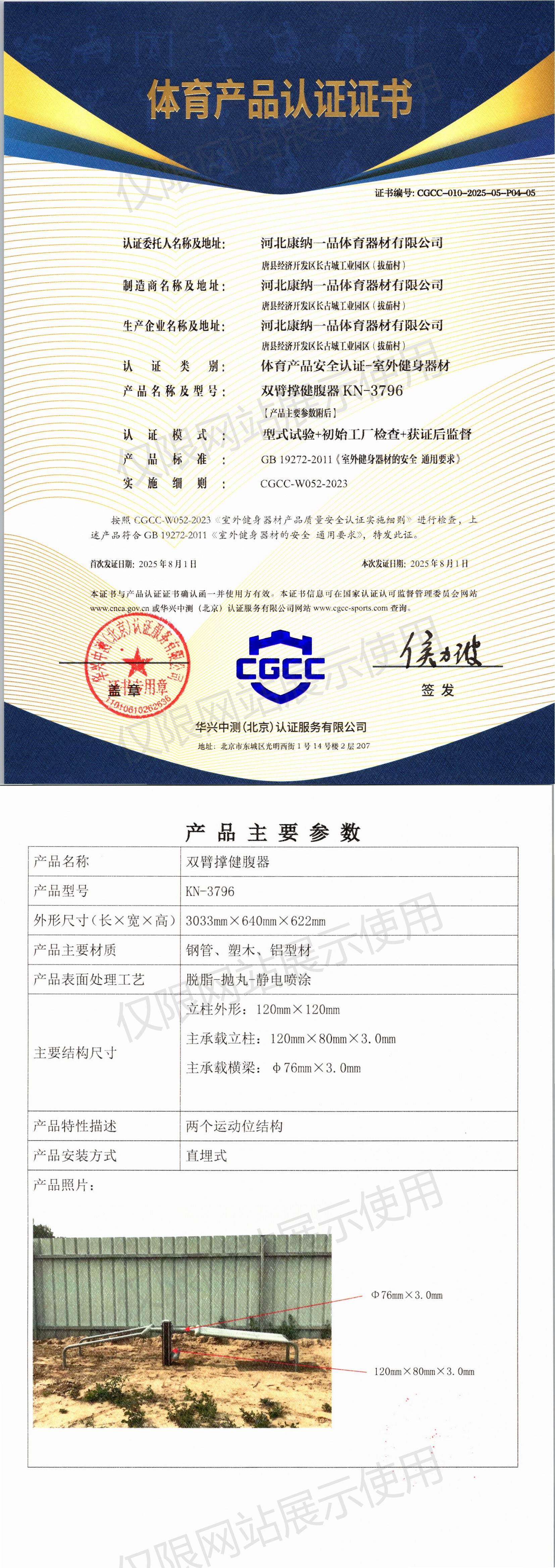 | 7 | 河北康纳一品体育器材有限公司 | CGCC-010-2025-05-P04-05 | 双臂撑健腹器 | KN-3796 | 唐县经济开发区长古城工业园区(拔茄村) | GB 19272-2011 | 2025-08-01 | 有效 | 查看 |