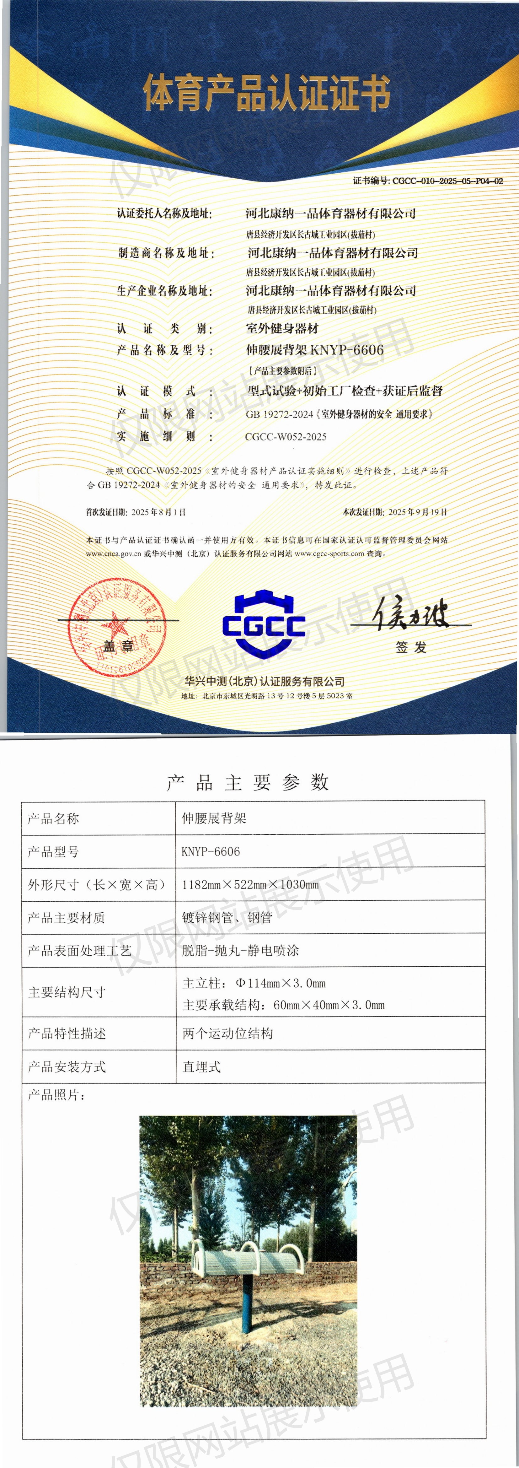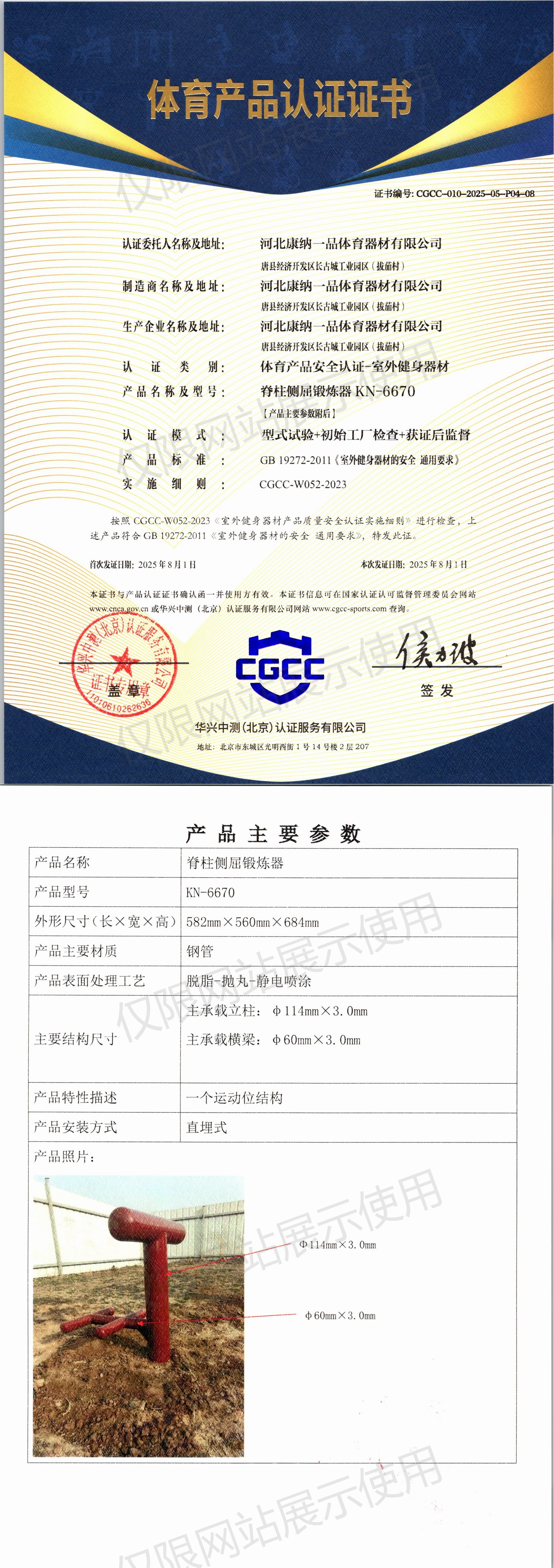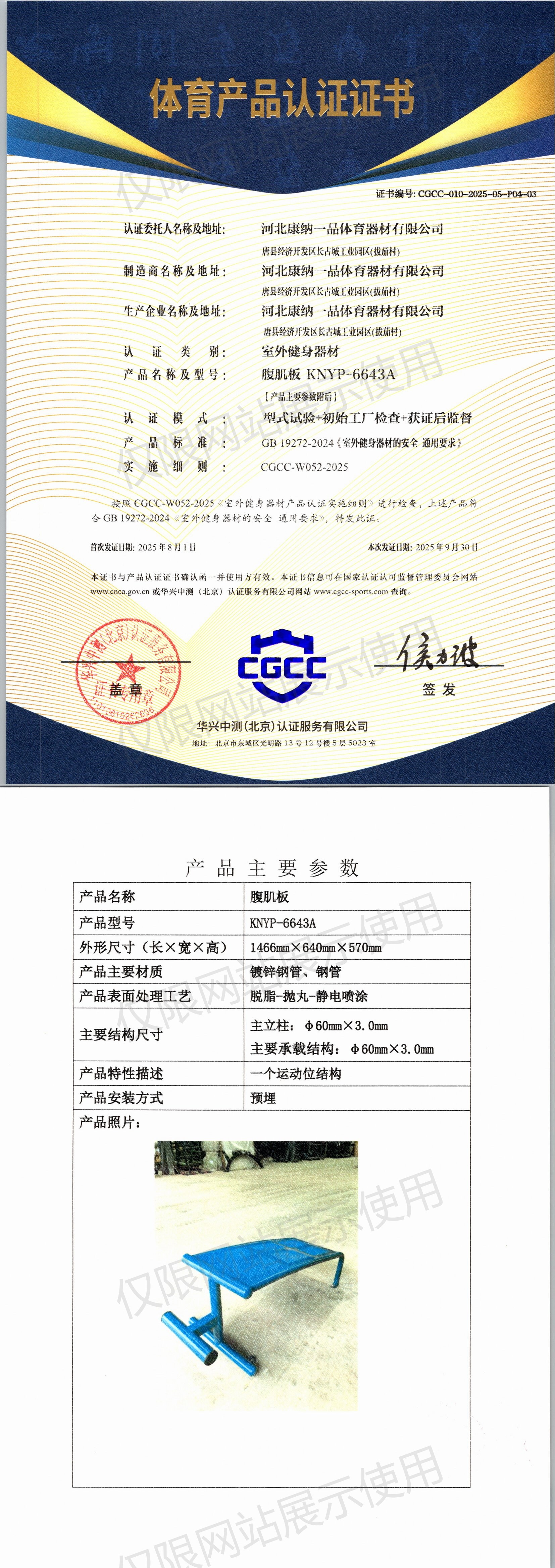 | 5 | 河北康纳一品体育器材有限公司 | CGCC-010-2025-05-P04-03 | 腹肌板 | KNYP-6643A | 唐县经济开发区长古城工业园区(拔茄村) | GB 19272-2024 | 2025-08-01 | 有效 | 查看 |