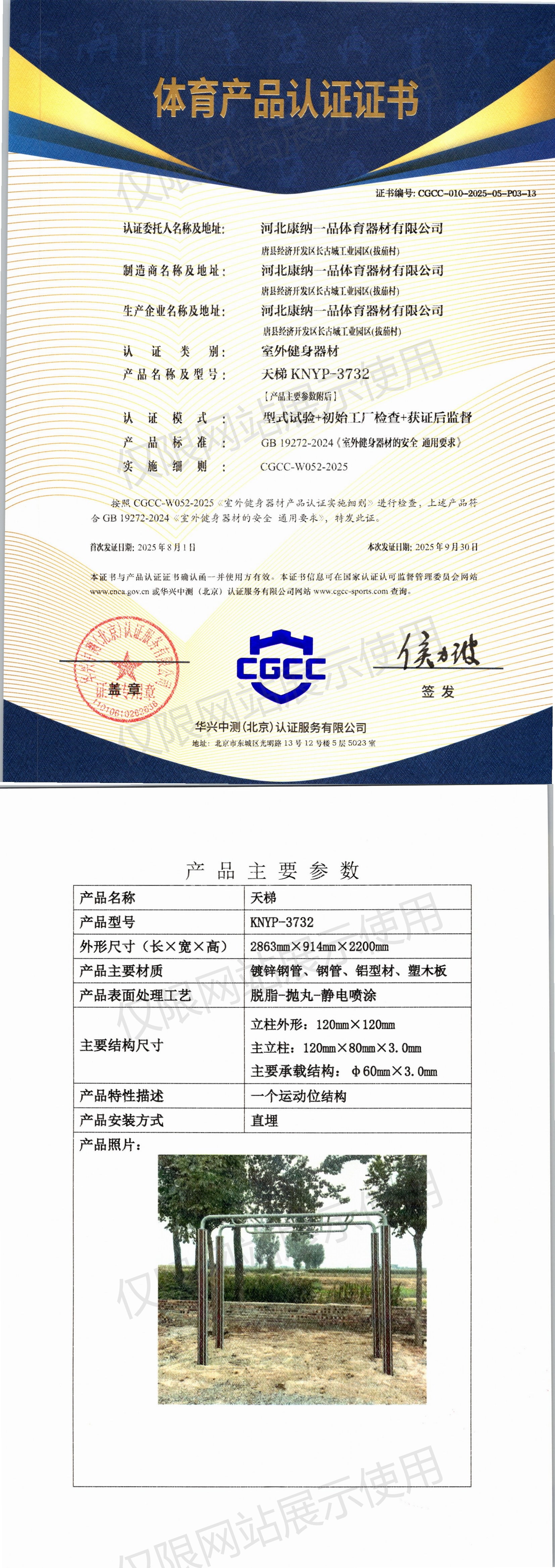 | 2 | 河北康纳一品体育器材有限公司 | CGCC-010-2025-05-P03-13 | 天梯 | KNYP-3732 | 唐县经济开发区长古城工业园区(拔茄村) | GB 19272-2024 | 2025-08-01 | 有效 | 查看 |