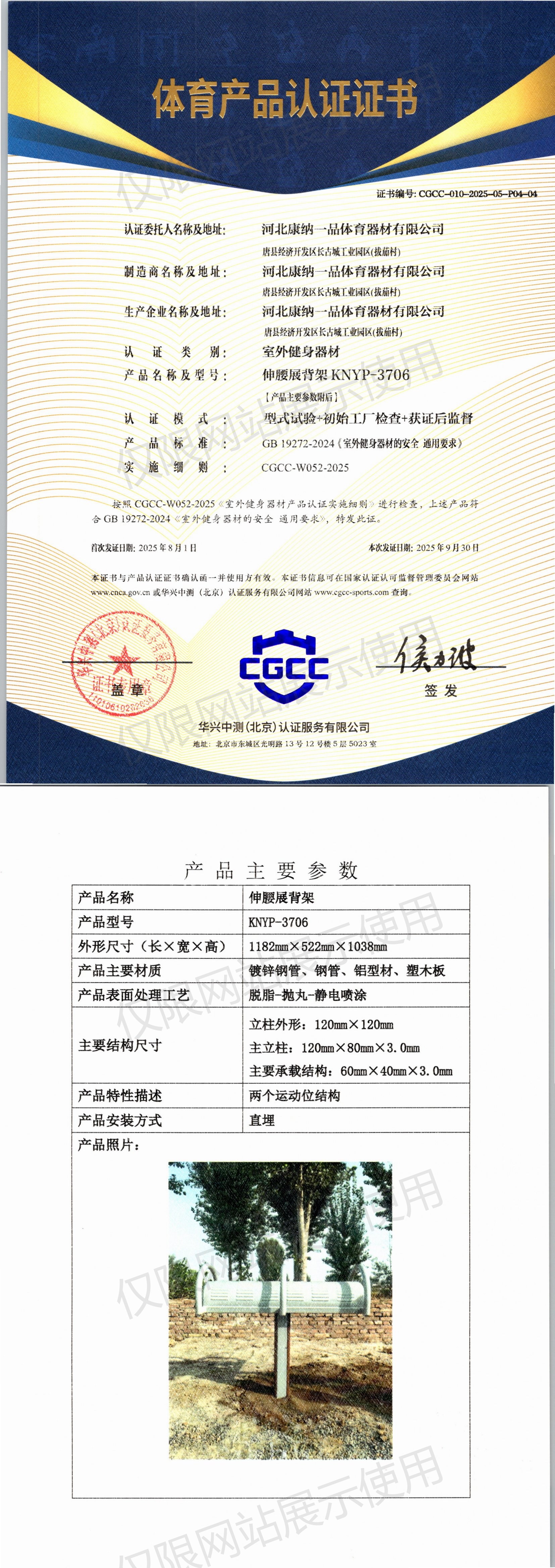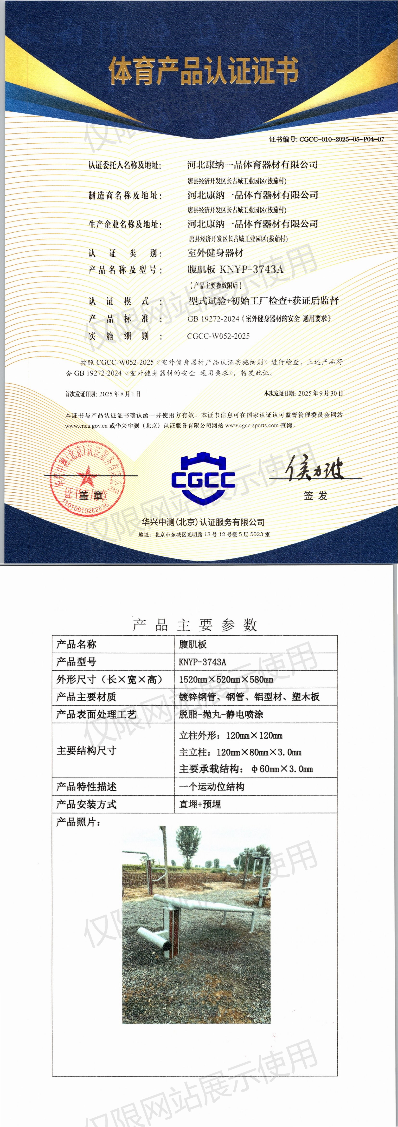 | 9 | 河北康纳一品体育器材有限公司 | CGCC-010-2025-05-P04-07 | 腹肌板 | KNYP-3743A | 唐县经济开发区长古城工业园区(拔茄村) | GB 19272-2024 | 2025-08-01 | 有效 | 查看 |